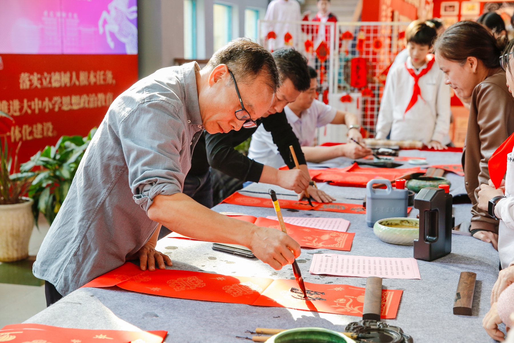 活动现场,红纸铺展,笔墨齐备,洋溢着浓浓的喜庆气氛。学校监事长邓达初、小学部校长徐曙,以及书法教师李振新、雷成奇应邀挥毫泼墨,成为全场瞩目的焦点。他们凝神聚气,笔走龙蛇,或遒劲有力,或娟秀典雅,将美好的祝愿倾注于一笔一划之间。一副副散发着清新墨香、寓意吉祥的春联和一个个饱满的“福”字顷刻而成,内容丰富多彩,既有传统新春祝福,也有勉励学子勤奋向上的励志佳句,更有倡导家校和睦、共育英才的殷切期望。