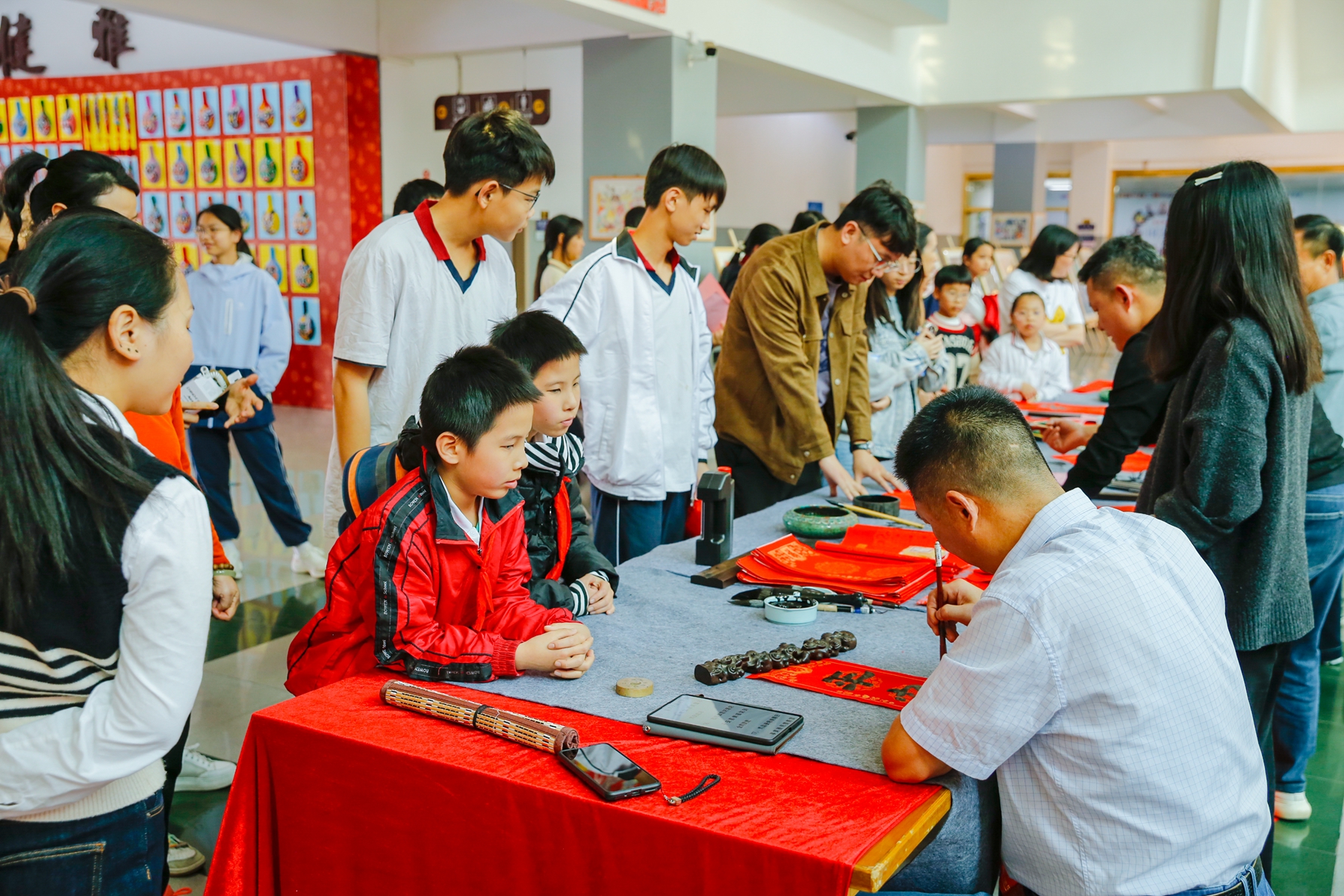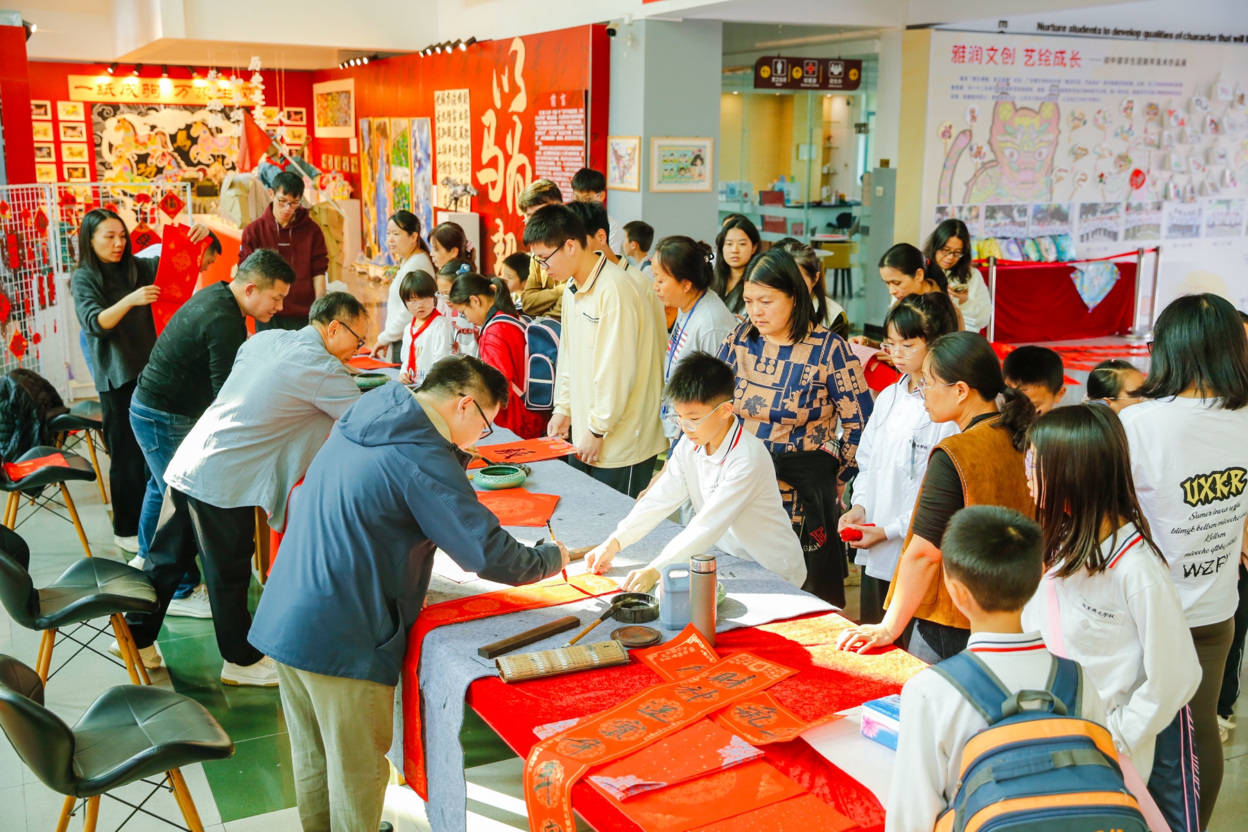 闻讯前来的师生、家长络绎不绝,他们或围在书法家身旁静静观赏,细细品味书法艺术的魅力;或精心挑选自己心仪的对联词句,排队等候“定制”专属祝福;或迫不及待地展示刚刚“新鲜出炉”的春联,相互品评,笑意盈盈。大家手捧红火的对联和“福”字,脸上绽放着开心的笑容,浓浓的年味和温情在校园里流淌。
