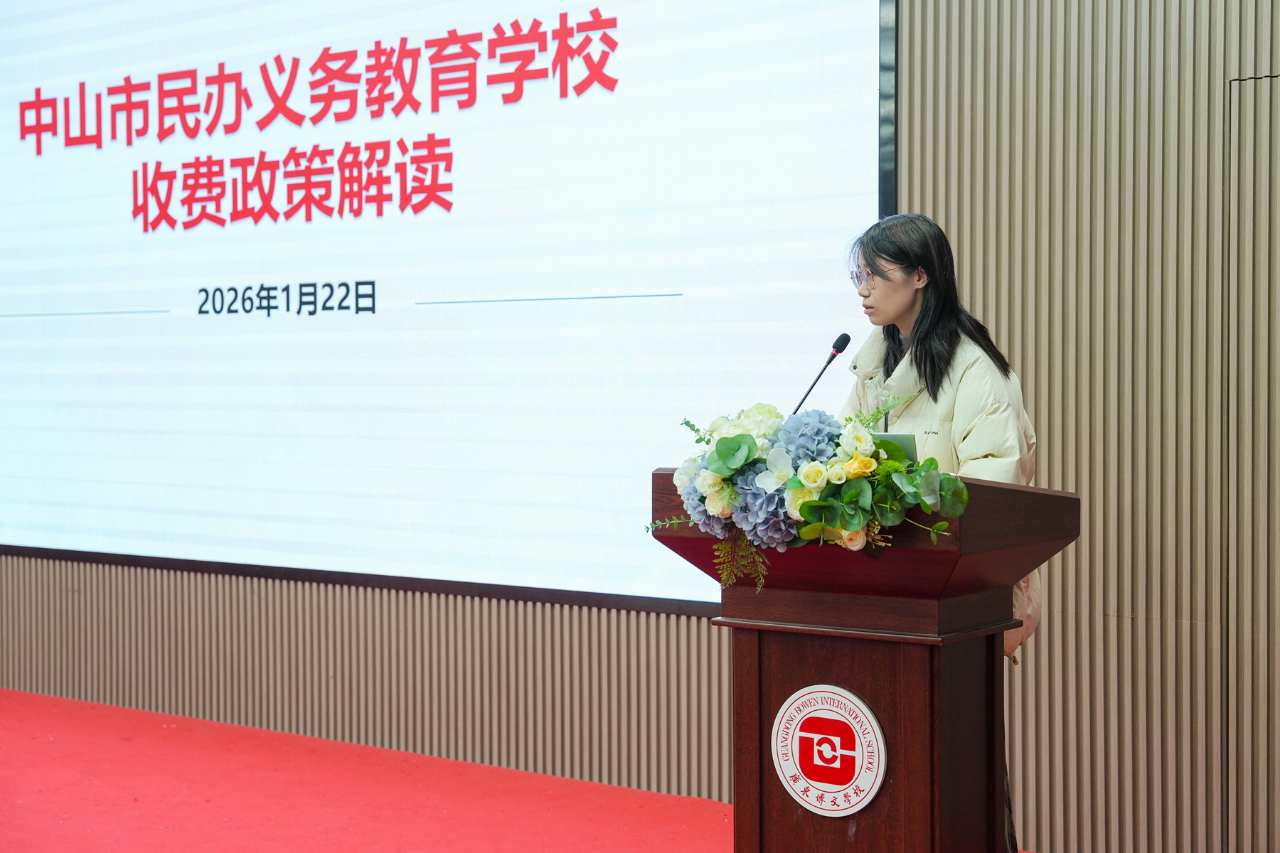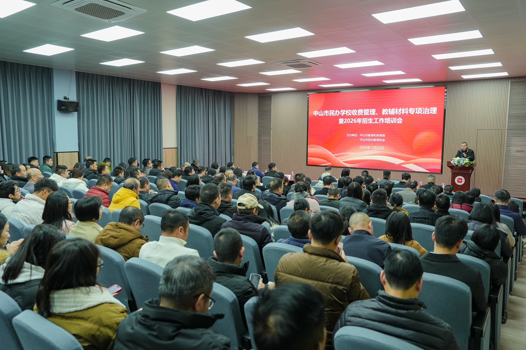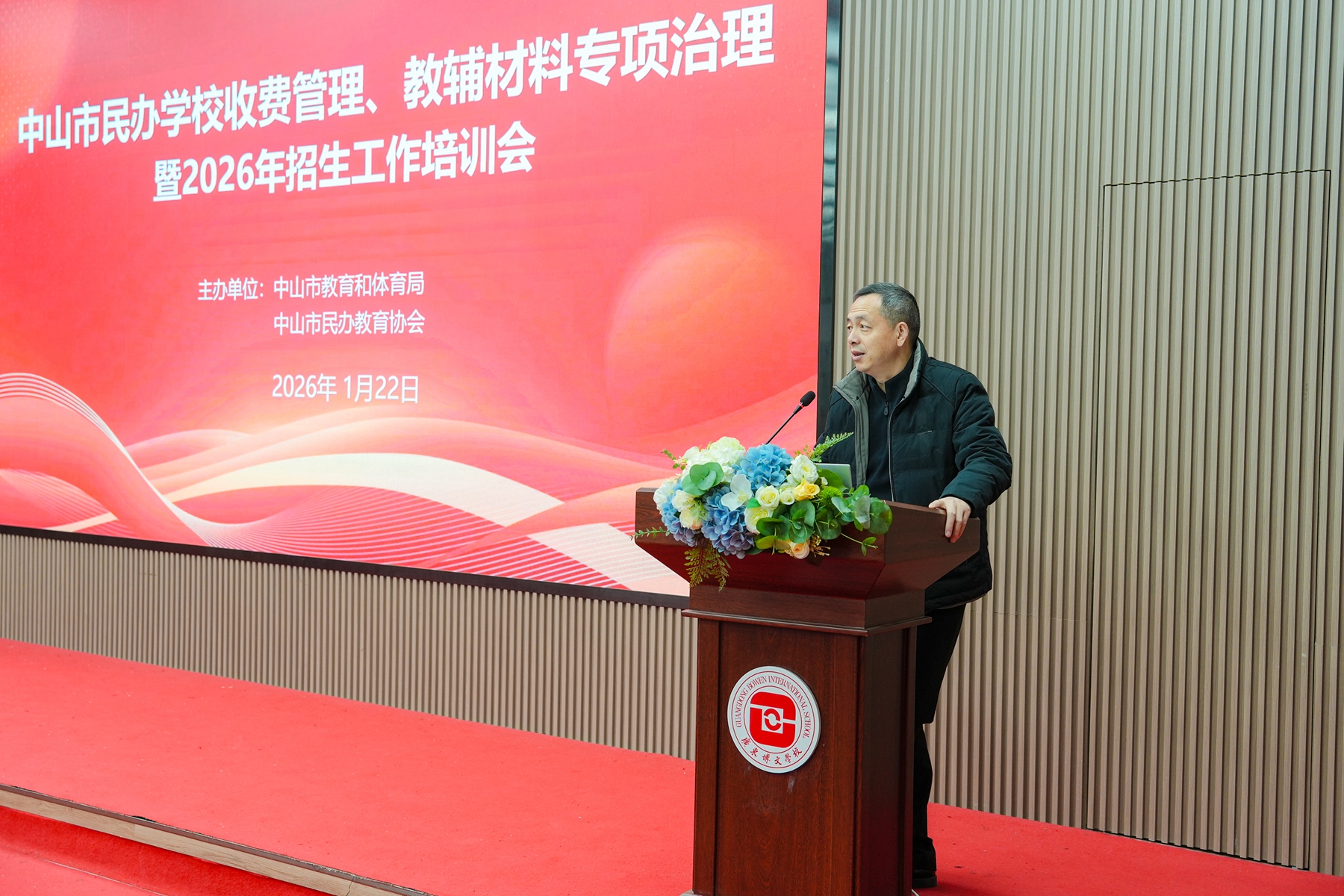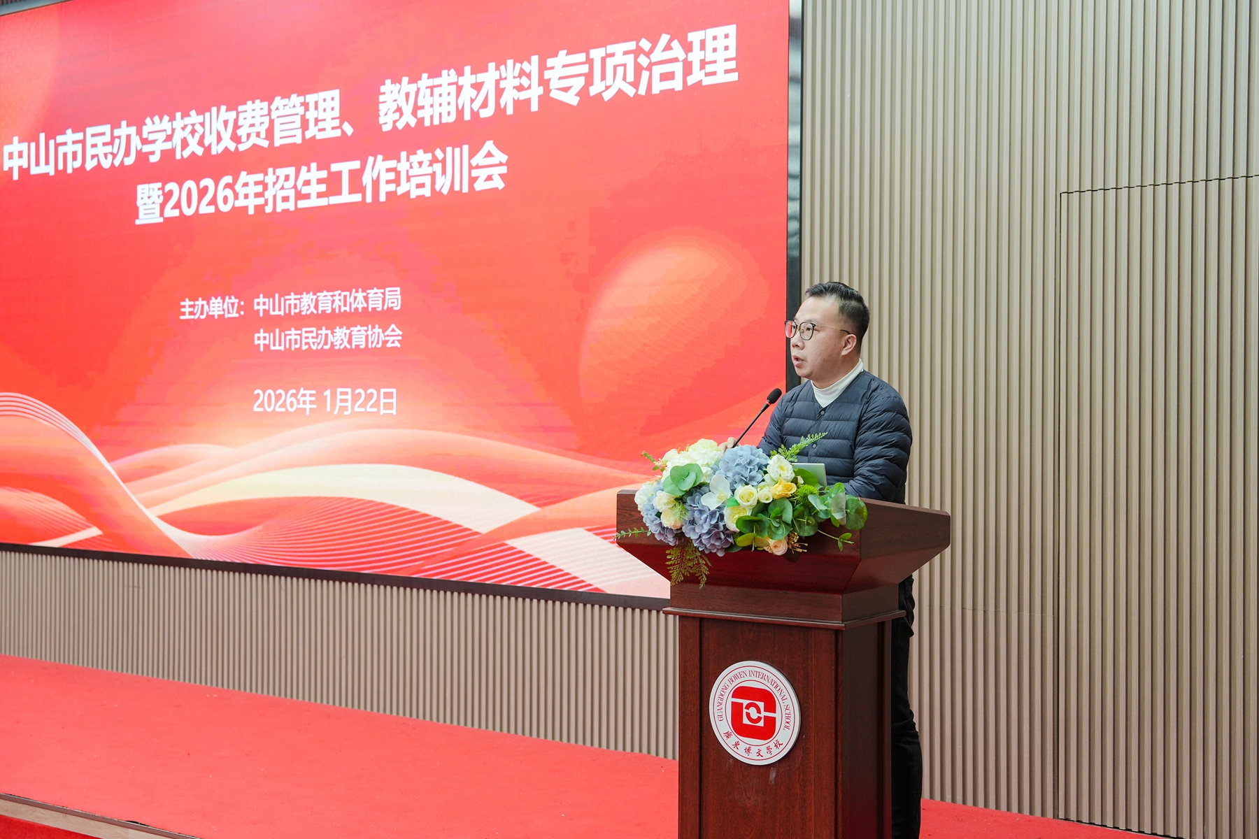 1月22日下午,由中山市教育和体育局、中山市民办教育协会主办的中山市民办学校收费、教辅材料专项治理暨2026年招生工作培训会在广东博文学校407报告厅顺利举行。市教育和体育局、市发展改革局、市民办教育协会相关领导出席会议,各镇街教育部门分管负责人、全市民办中小学校相关负责同志参会,共同聚焦规范管理与质量提升,谋划民办教育健康发展新篇章。