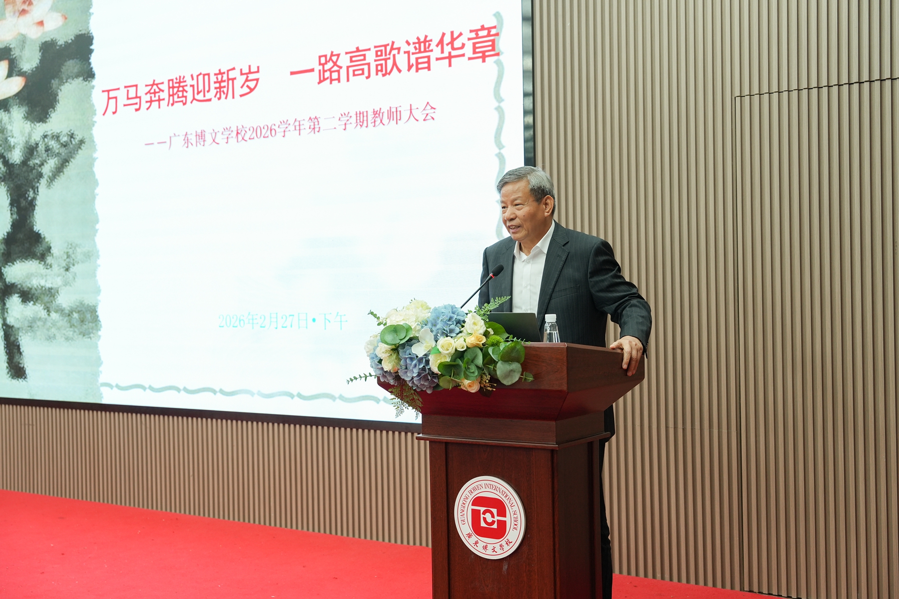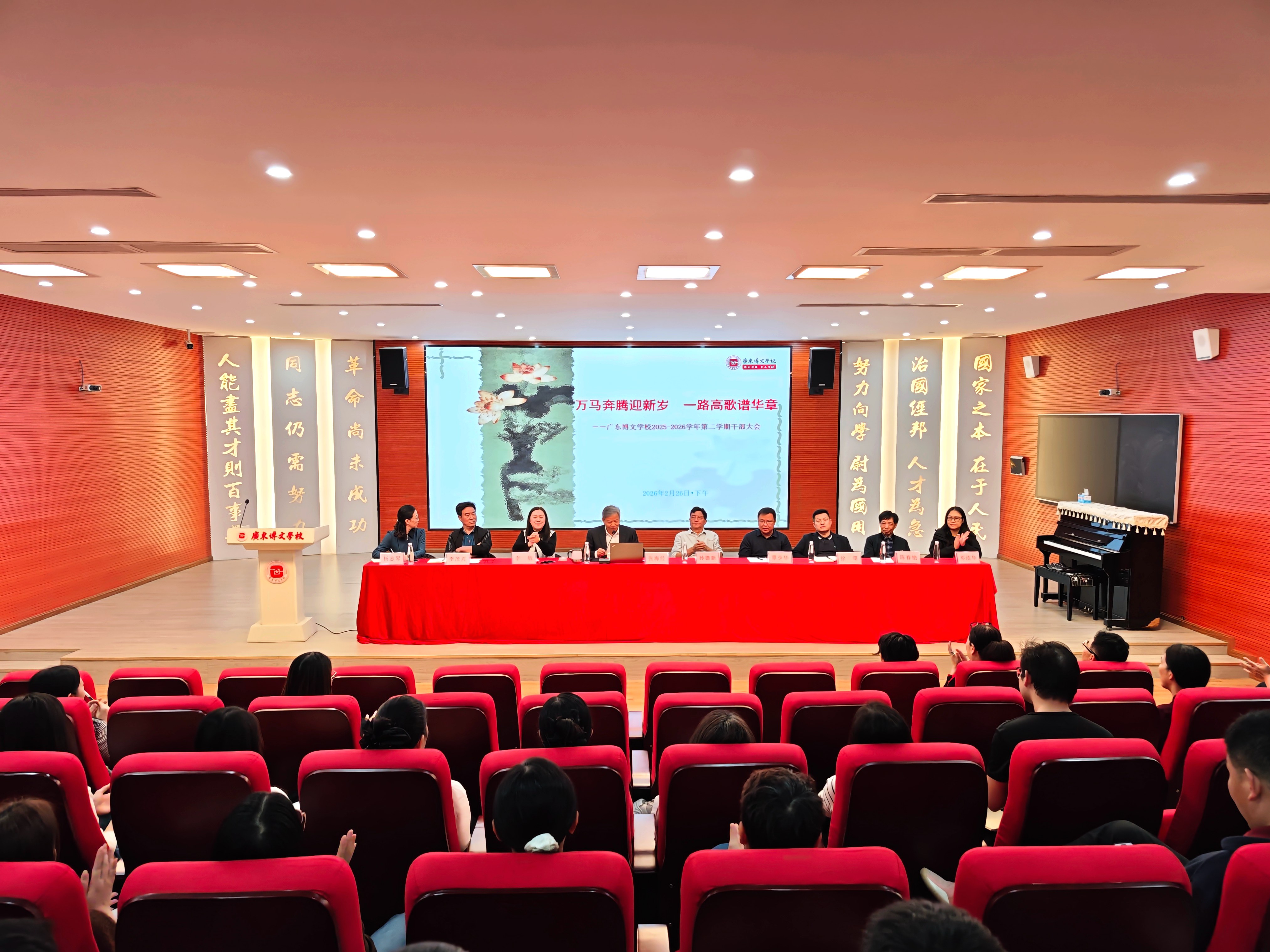 春潮涌动启新程,策马扬鞭向未来。2026年2月26日至27日,广东博文学校相继召开2025-2026学年第二学期干部大会与教师大会,校长张海经以“策”与“观”为核心,紧扣教育新形势下的“变”与“不变”,为全校管理干部与教职工明晰发展方向、擘画育人蓝图。在干部大会上,张海经校长指出以“策”御变定方略,探索管理提质增效的实践路径;在教师大会上,张海经校长强调要以“观”明心立根本,筑牢教育高质量发展的思想根基。两场大会一脉相承、层层递进,凝聚起“万马奔腾迎新岁,一路高歌谱华章”的奋进共识,为新学期学校发展注入强劲动力。