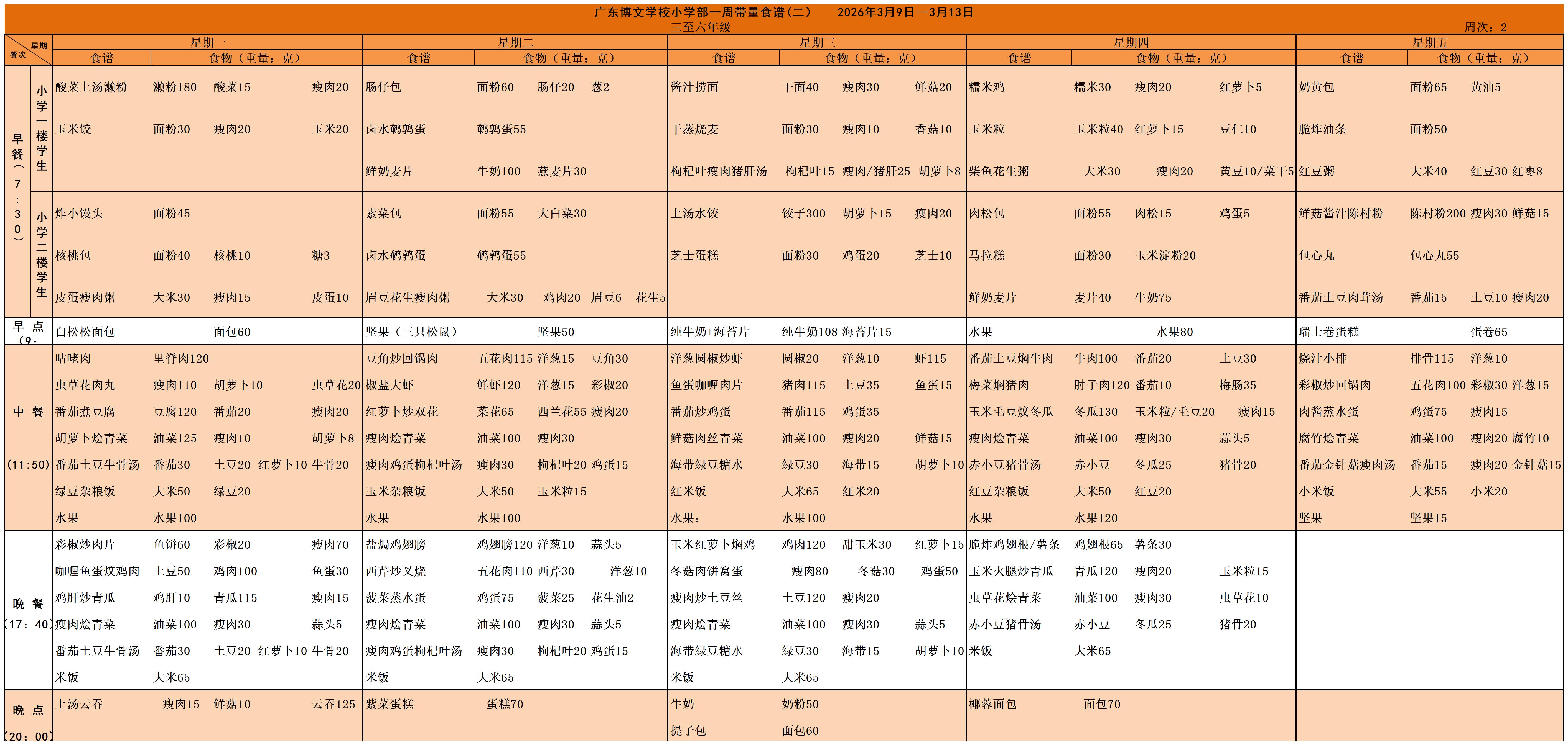 广东博文学校第一周食谱公示