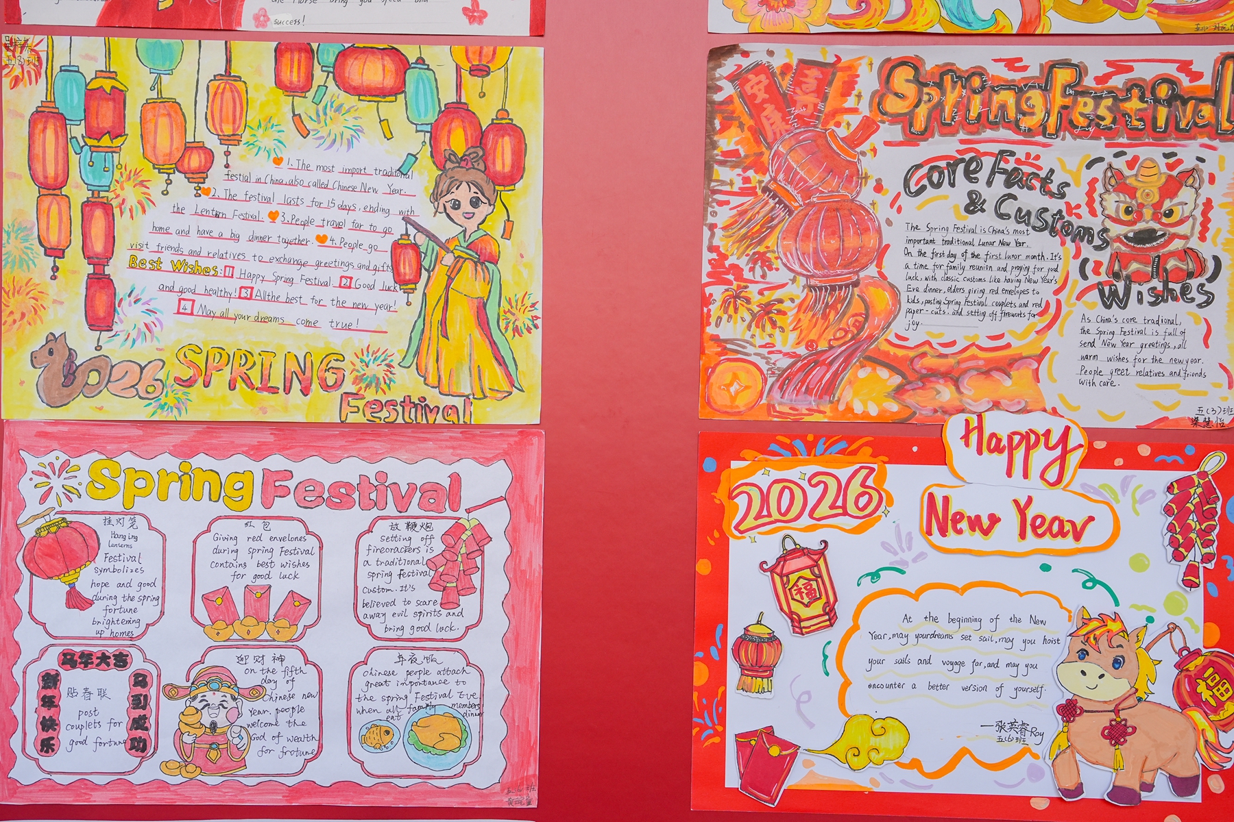 “正雅少年,策马绽芳华”,五年级围绕“正雅”教育理念,设计了“文润心、数启智、英飞扬”的多元实践作业,让孩子们在实践中成长、在探索中进步。语文实践中,同学们读名著经典、写读书记录卡,在书香中积淀文化底蕴、提升文学素养;品年俗、写对联、制作手工灯笼,在亲身体验中传承传统文化,感受中华文脉的魅力,让文化自信在心中生根发芽。数学实践中,孩子们通过绘画或手工的形式,展示正方体、长方体展开平面图,在动手操作中深化对几何图形的理解,锤炼空间思维与动手能力,实现“以数启智、以行践学”。英语实践中,同学们制作过年习俗手抄报,将春节文化与英语知识巧妙融合,在创作中巩固语言知识、了解中西文化差异,提升跨文化交流能力,展现了正雅少年多元发展的综合素养。