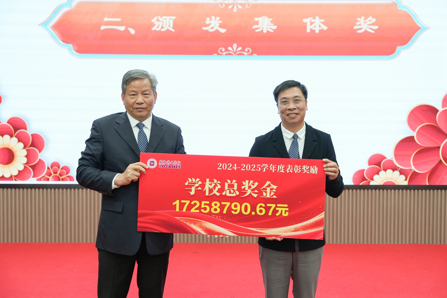 学校理事长邓江华为学校颁授年度总奖金,总校长张海经代表学校接受这份沉甸甸的肯定。随后,张海经为各学部颁发绩效奖金、升学奖金及高中学科教学质量提升激励奖。