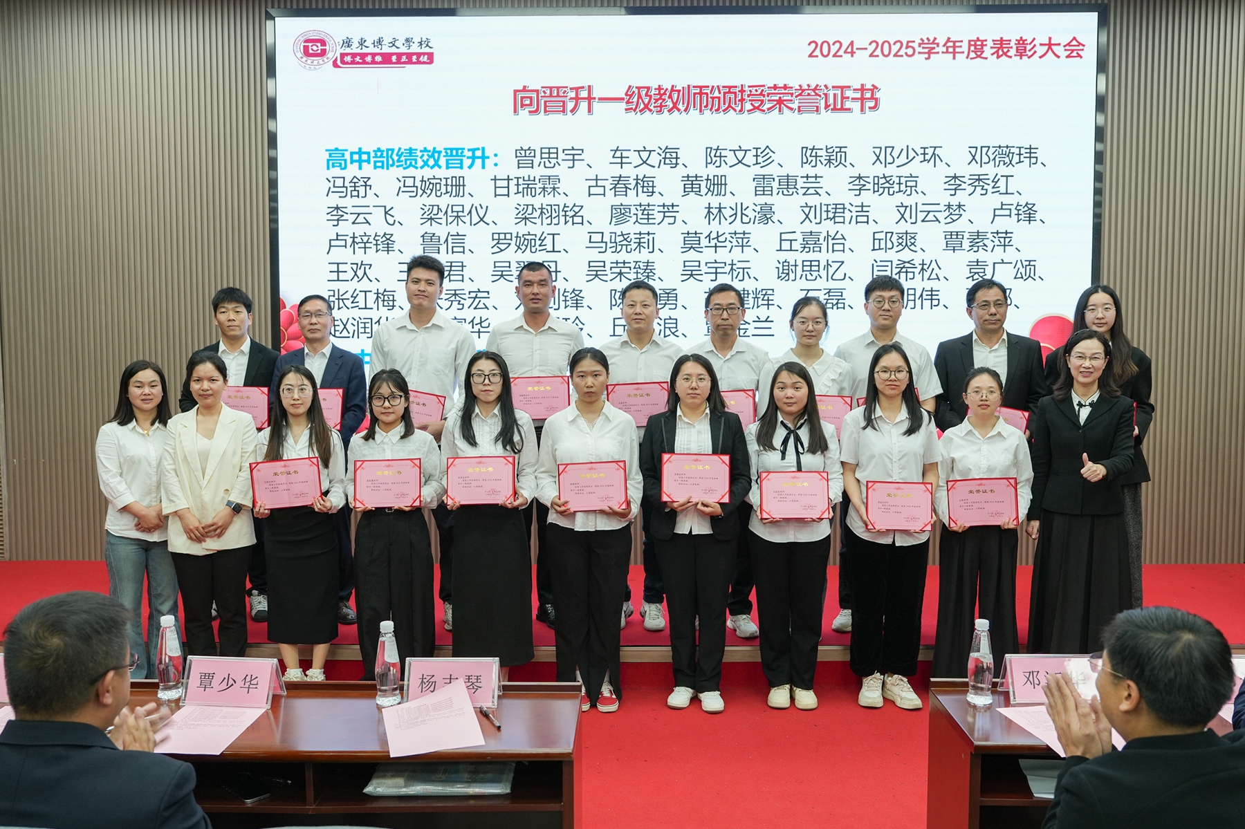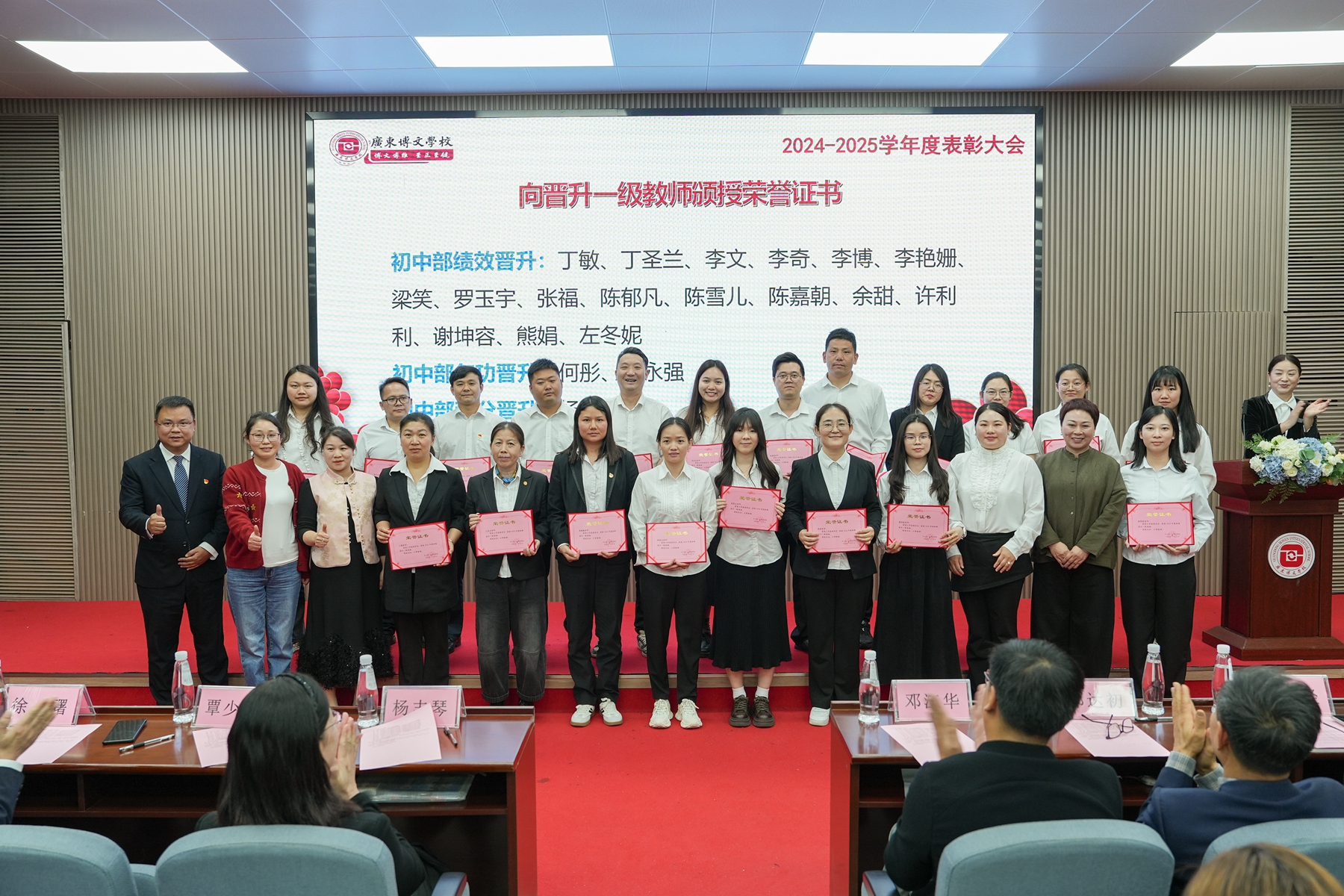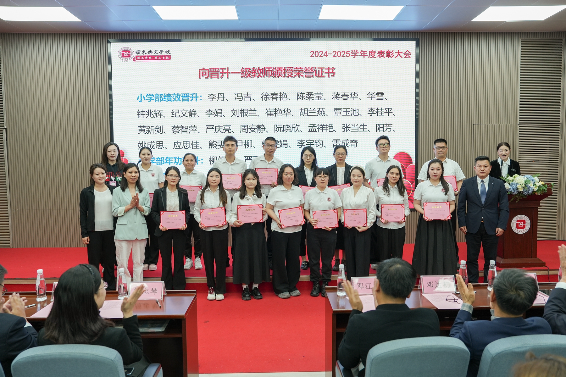 大会在庄重热烈的氛围中启幕。学校党支部书记、副校长李敏宣读《广东博文学校2024-2025学年度表彰奖励决定》及《教师职级晋升一级与晋升两级通知》