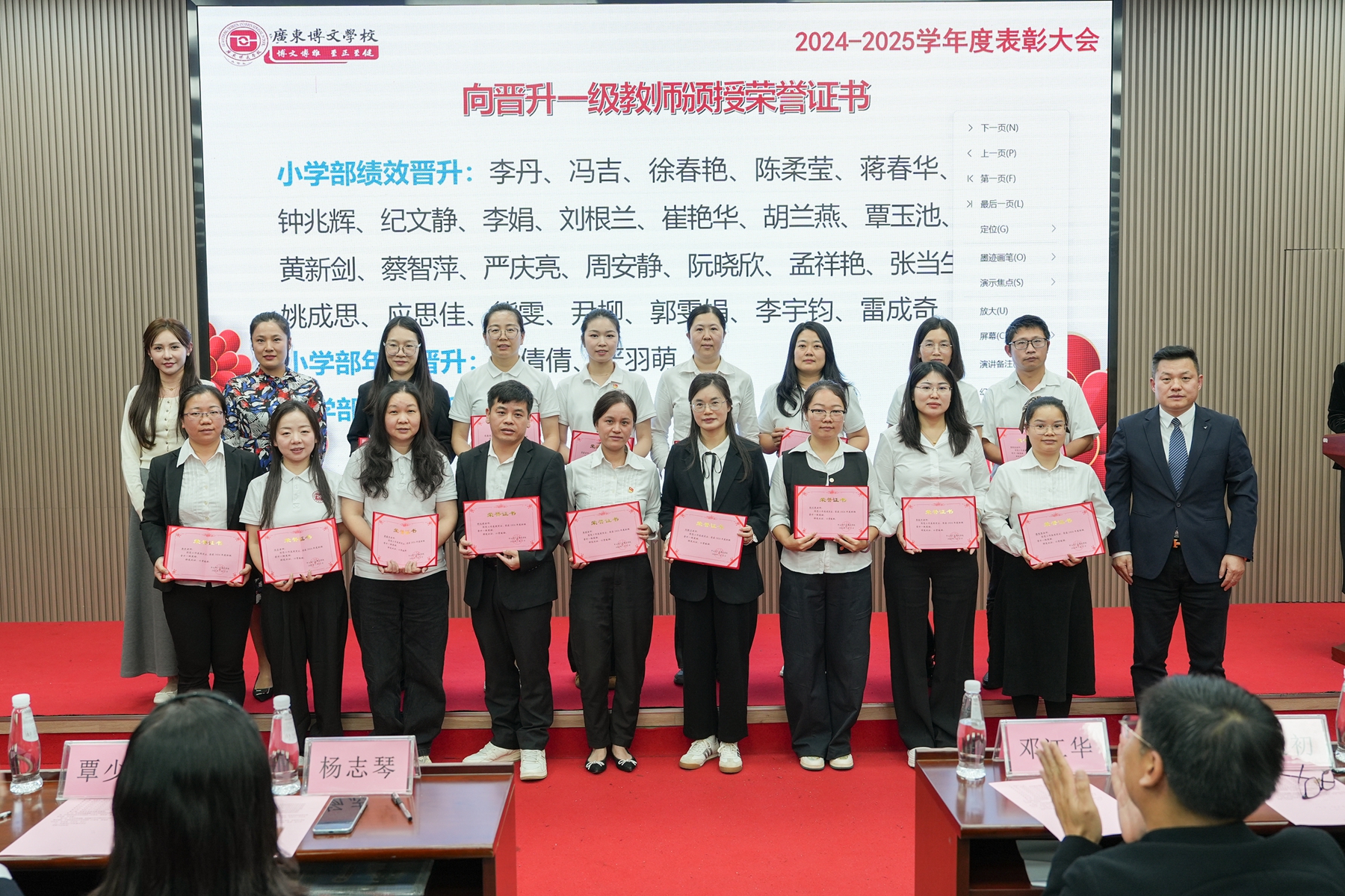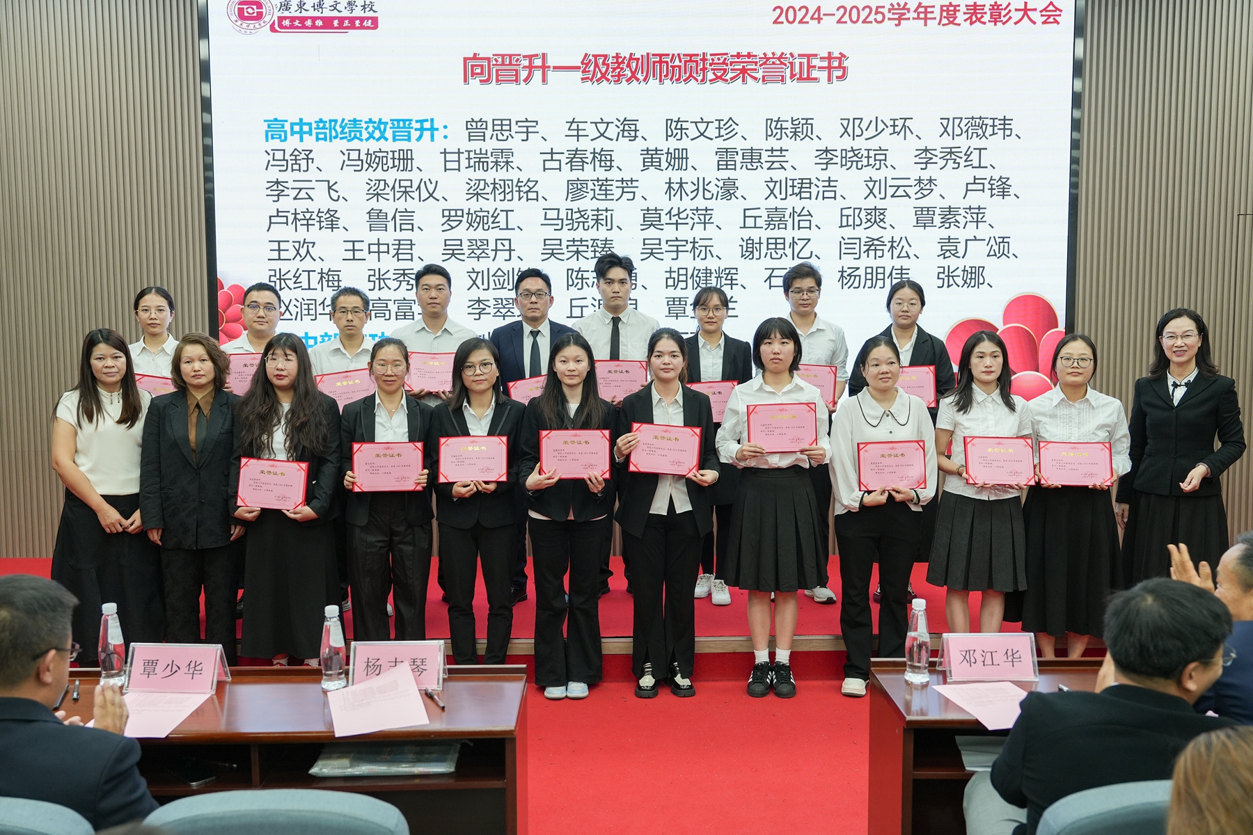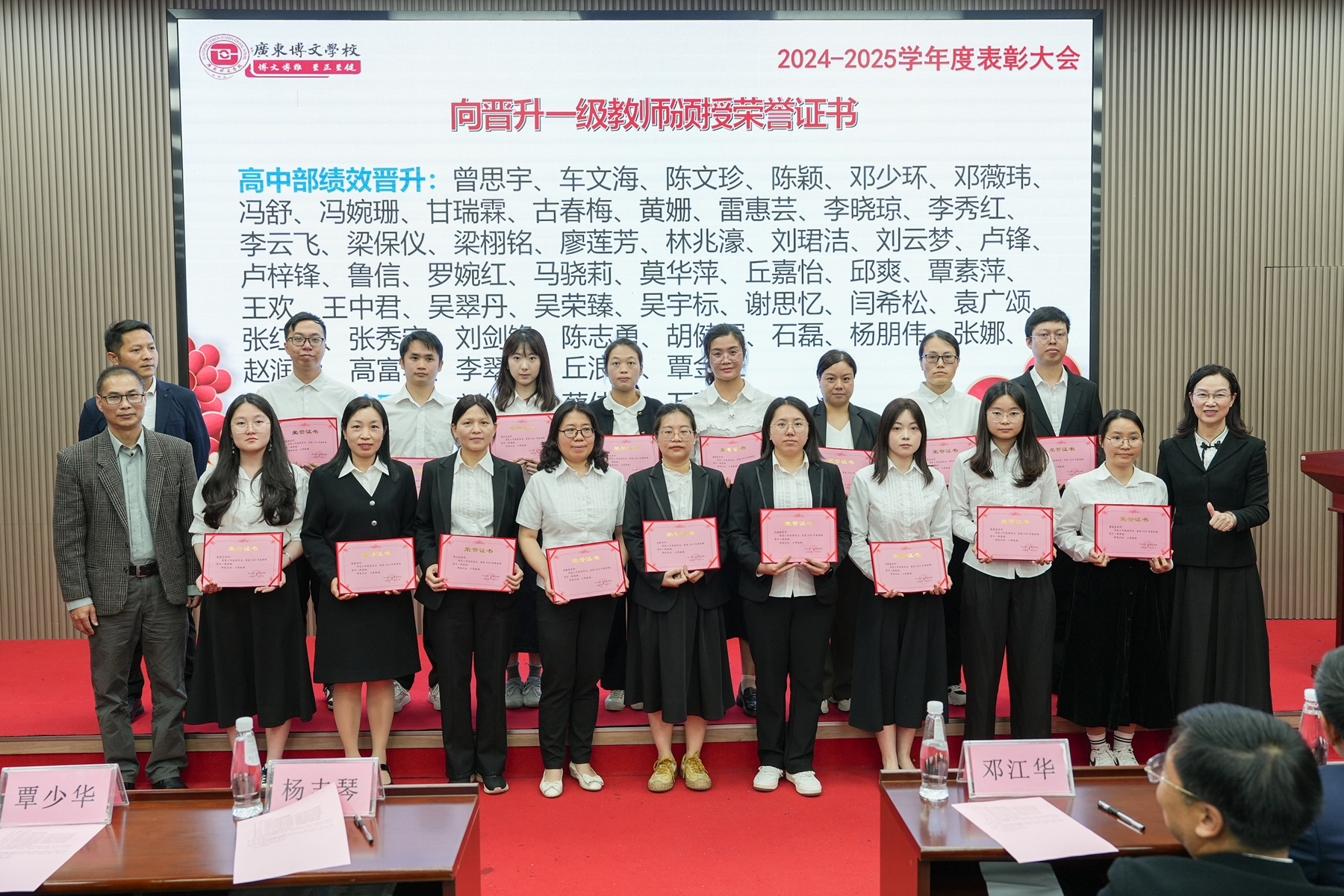 大会在庄重热烈的氛围中启幕。学校党支部书记、副校长李敏宣读《广东博文学校2024-2025学年度表彰奖励决定》及《教师职级晋升一级与晋升两级通知》