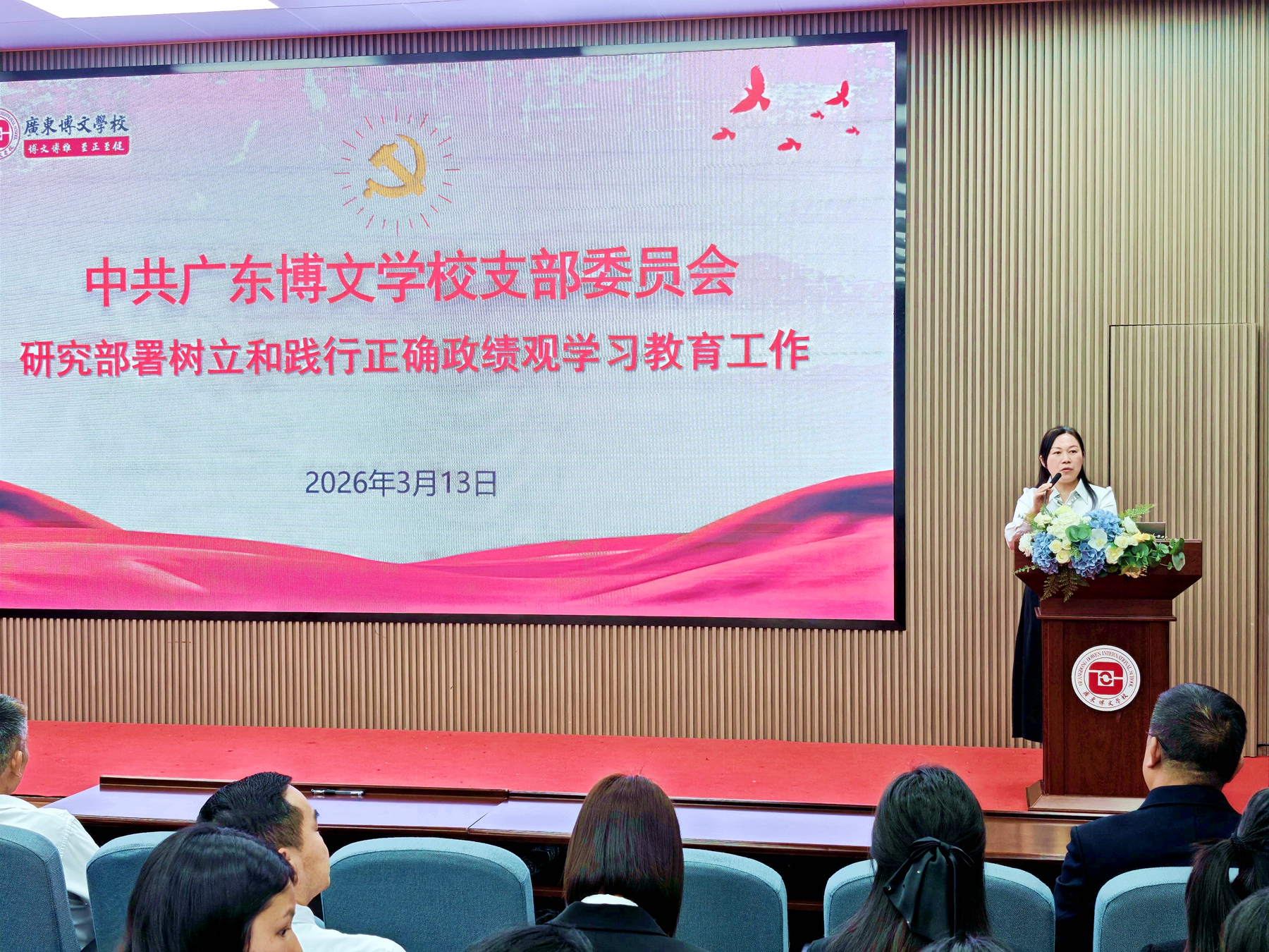 为深入学习贯彻党中央关于树立和践行正确政绩观的重大决策部署,引导全体党员教师牢固树立正确政绩观,以实干担当践行育人初心,2026年3月13日,广东博文学校党支部在综合楼407报告厅召开“研究部署树立和践行正确政绩观学习教育工作会”,会议由党支部书记李敏领学,全体党员教师出席。