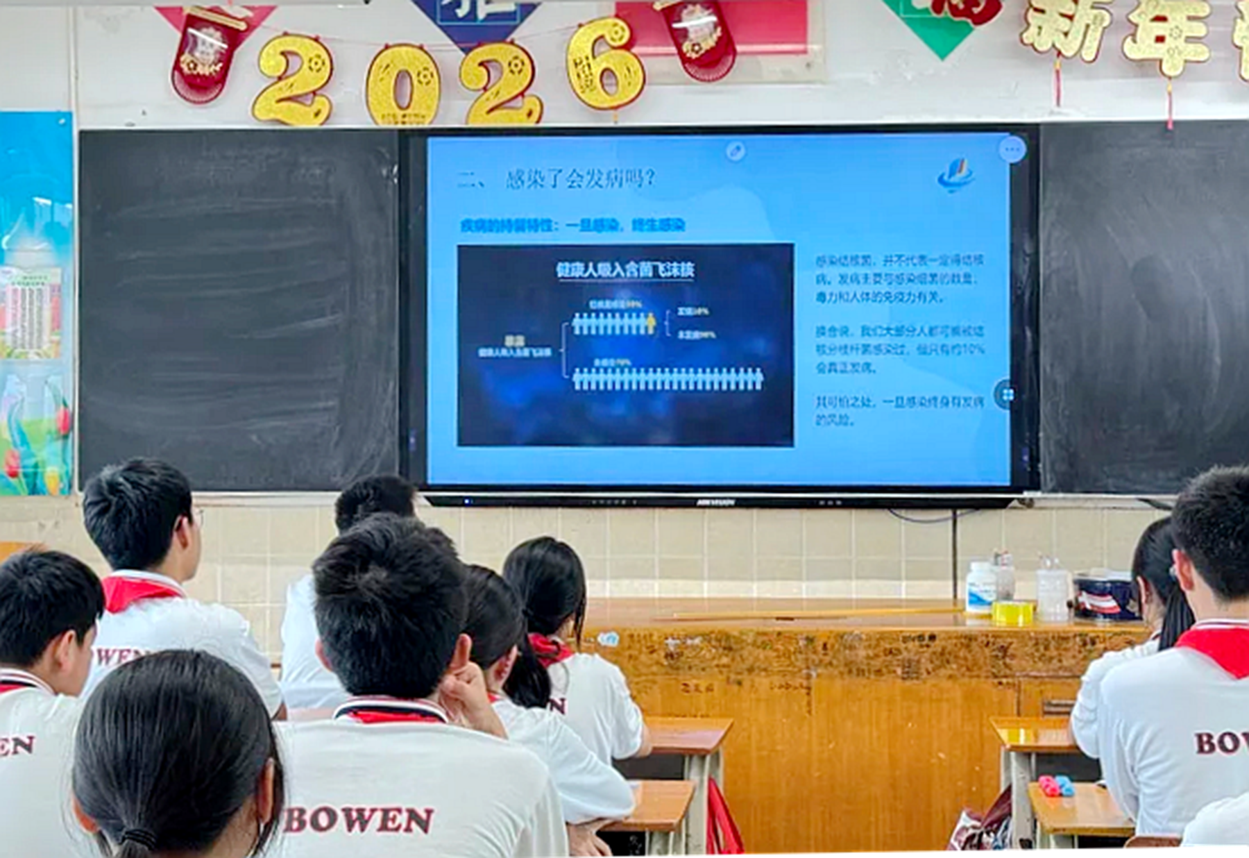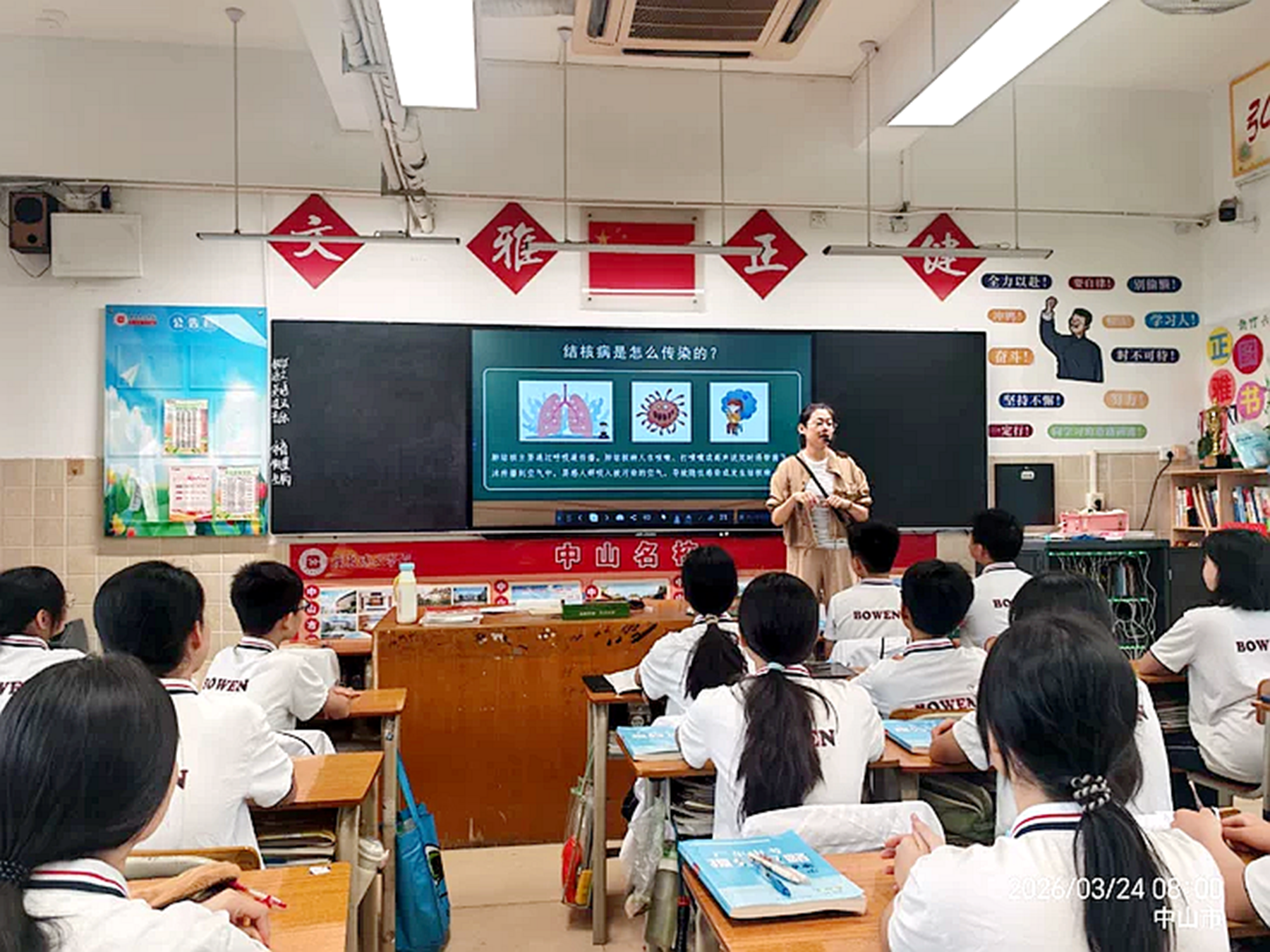 3月23日,初中部组织全体初二学生集中观看了“2026年中山市初二学生预防结核病专题视频讲座”。讲座内容详实,专家讲解深入浅出,让学生们系统了解了结核病的传播途径、核心症状及国家免费治疗政策。3月24日当天,初中部教学楼LED电子屏全天候滚动播放结核病防治宣传视频,以直观的视觉冲击力,将“勤洗手、多通风、强体魄”的健康理念植入师生心间。