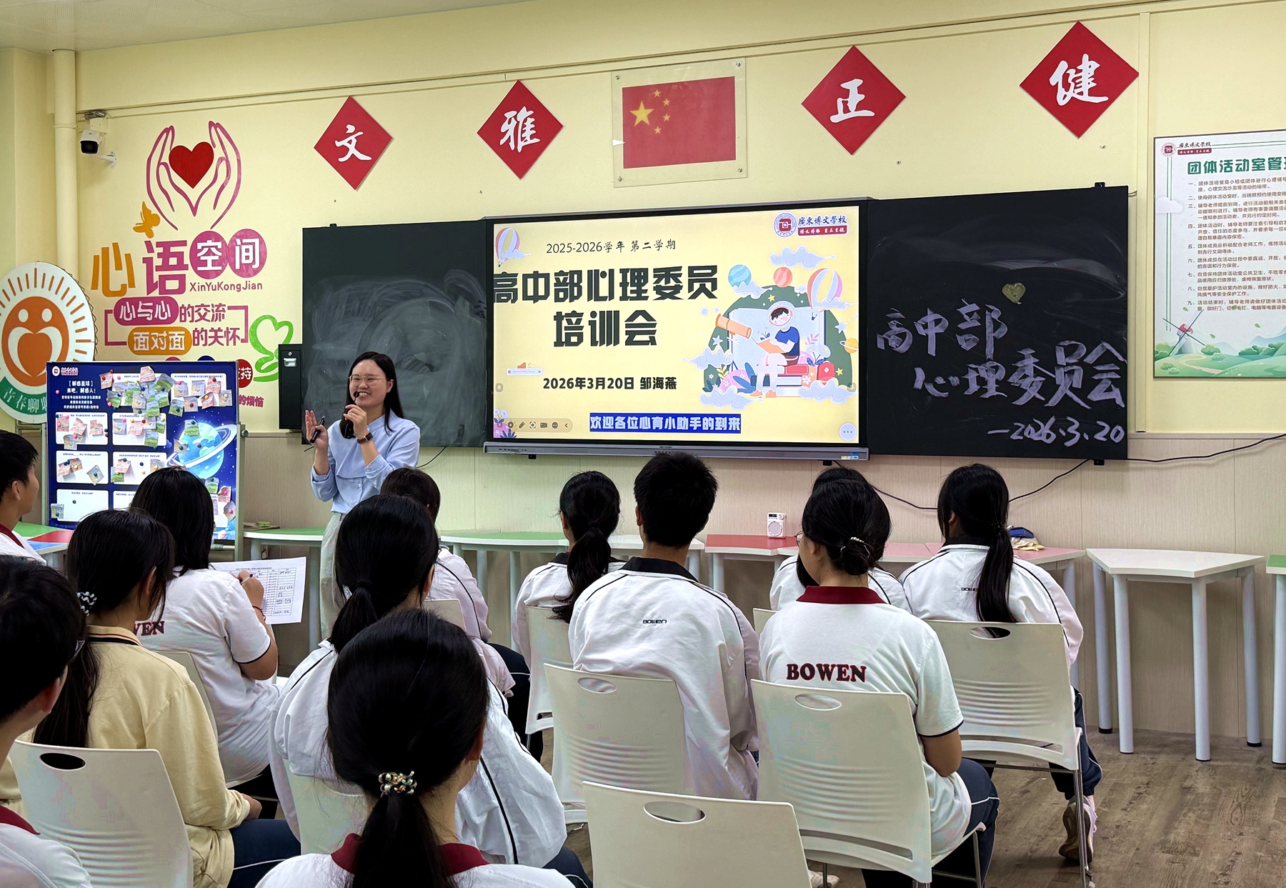 为深化学校心理健康教育工作,提升学生朋辈心理互助能力,构筑坚实的校园心理支持网络,广东博文学校高中部于3月27日成功举办了面向全体班级心理委员的专题培训,本次培训旨在帮助心理委员们明确自身职责,掌握基本的心理助人技能,成为同学们身边可信赖的“心灵充电站”。