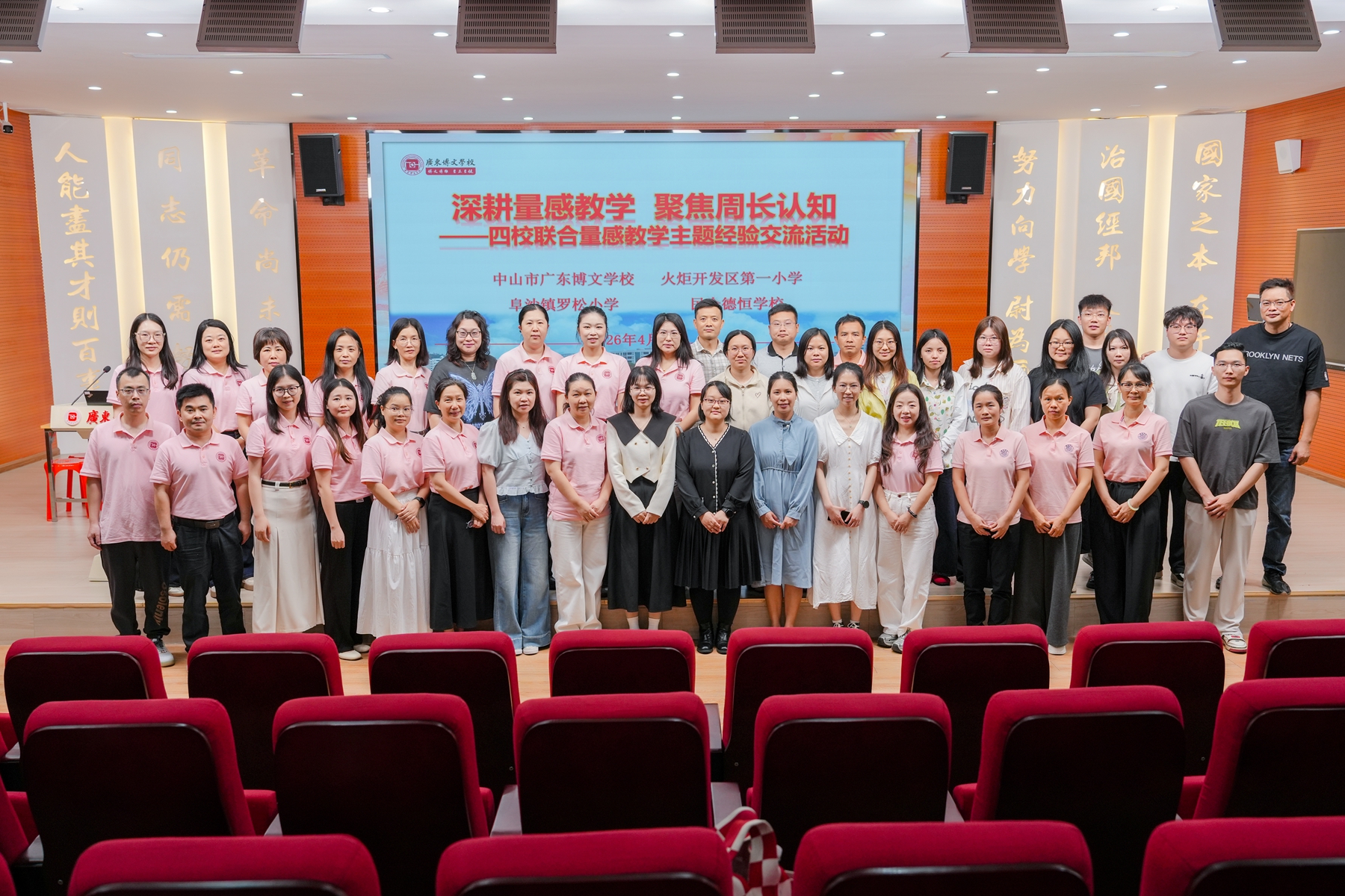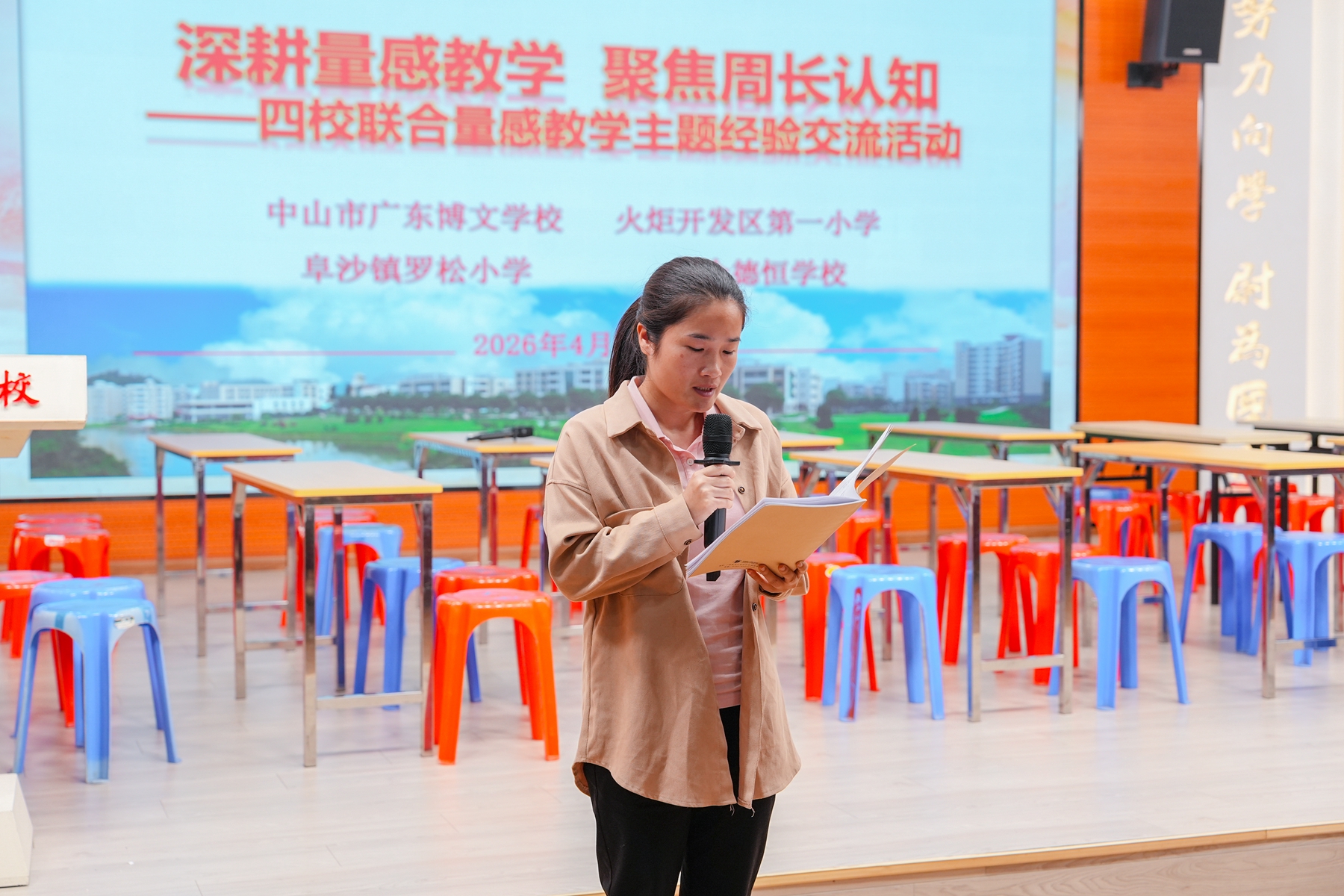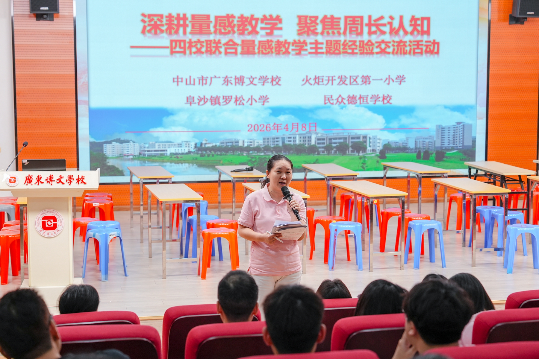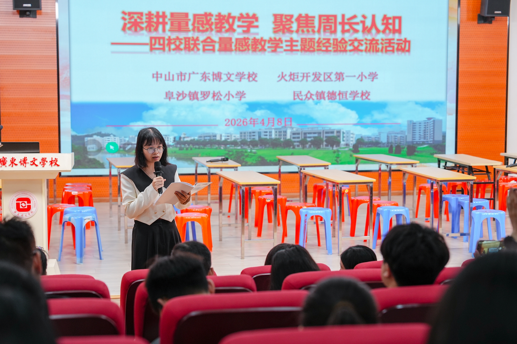 2026年4月8日,中山市广东博文学校小学部、开发区第一小学、阜沙镇罗松小学、民众德恒学校联合开展数学教研活动,以“深耕量感教学,聚焦周长认知”为主题,共研教学策略,共促专业提升。