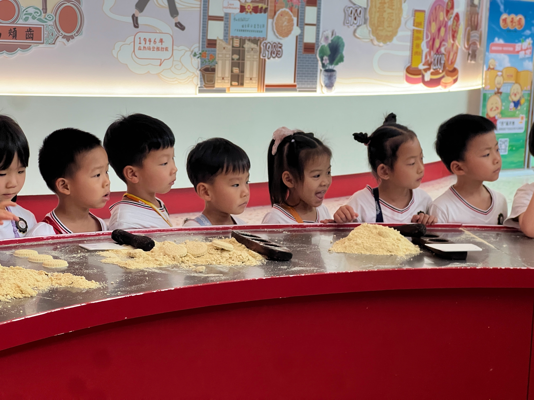 刚踏入咀香园饼文化博览馆,宝贝们的小眼睛就充满了好奇,跟着讲解员的脚步一起翻开百年咀香园的历史画卷。宝贝们了解到咀香园食品有限公司从1918年创立至今,从石岐小巷的饼家到名扬海外的中华老字号,从传统杏仁饼到荣获国际大奖,每一张老照片、每一件旧模具都在诉说着时光里的匠心故事。