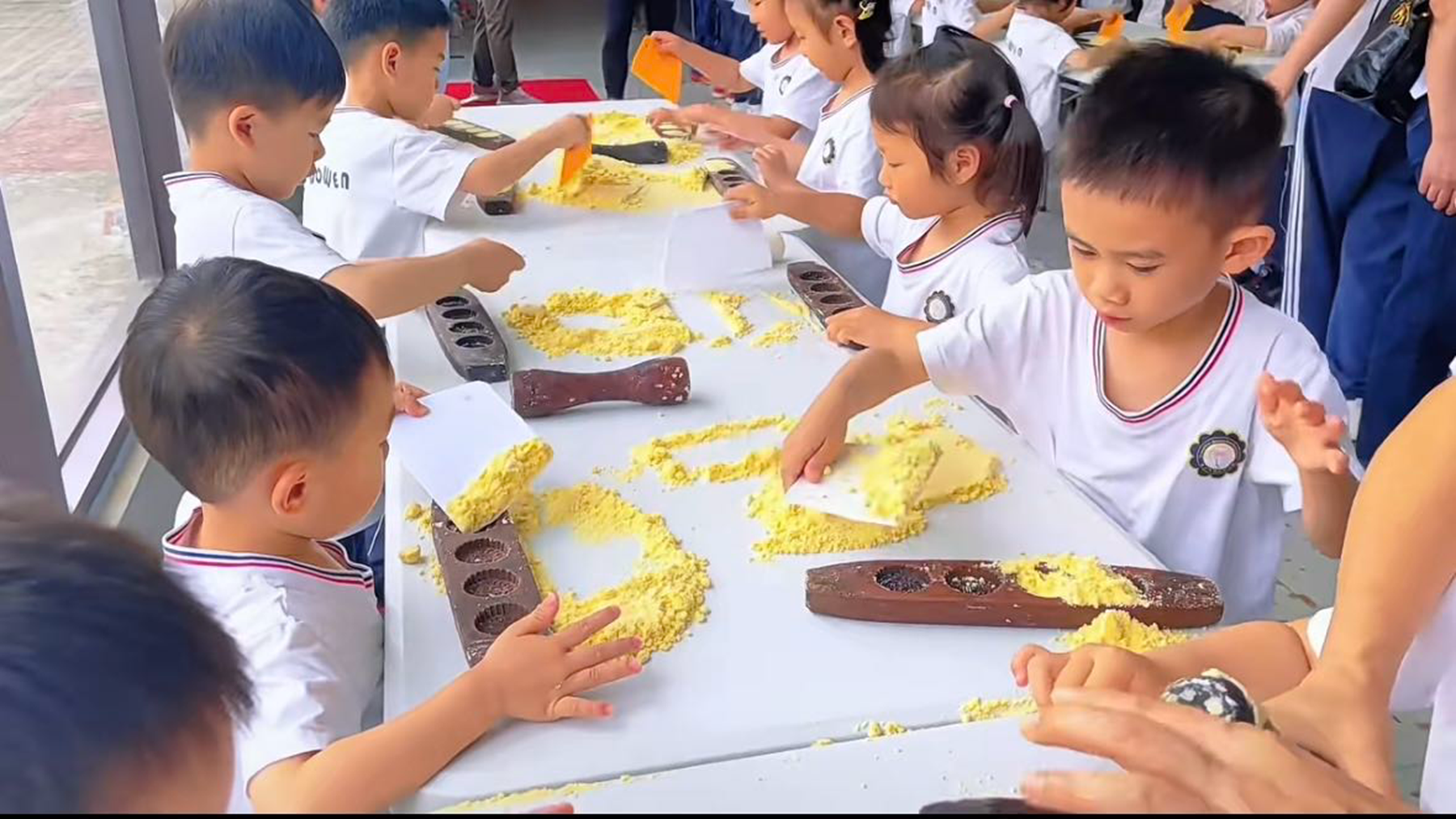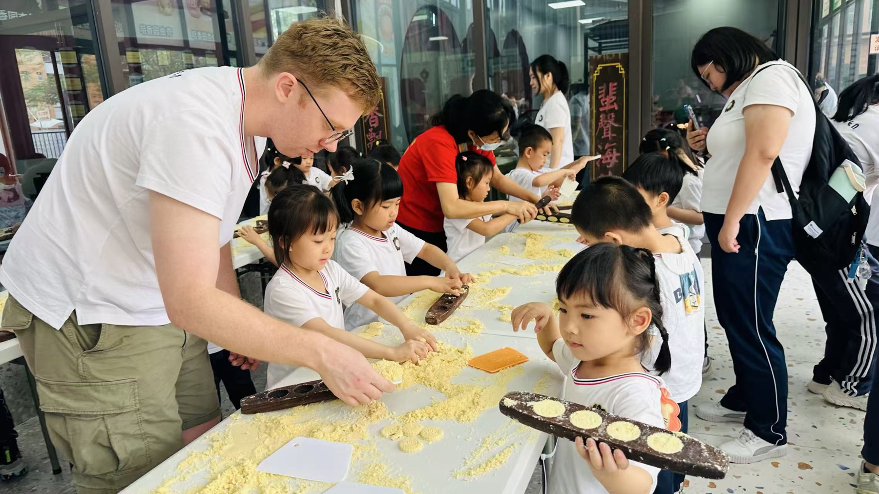 最期待的DIY 制饼环节终于来啦!摇身一变,萌娃们化身小小烘焙师,洗净小手后在制饼师傅的耐心指导下认真学习每一步:筛粉、铺料、压模、脱模。