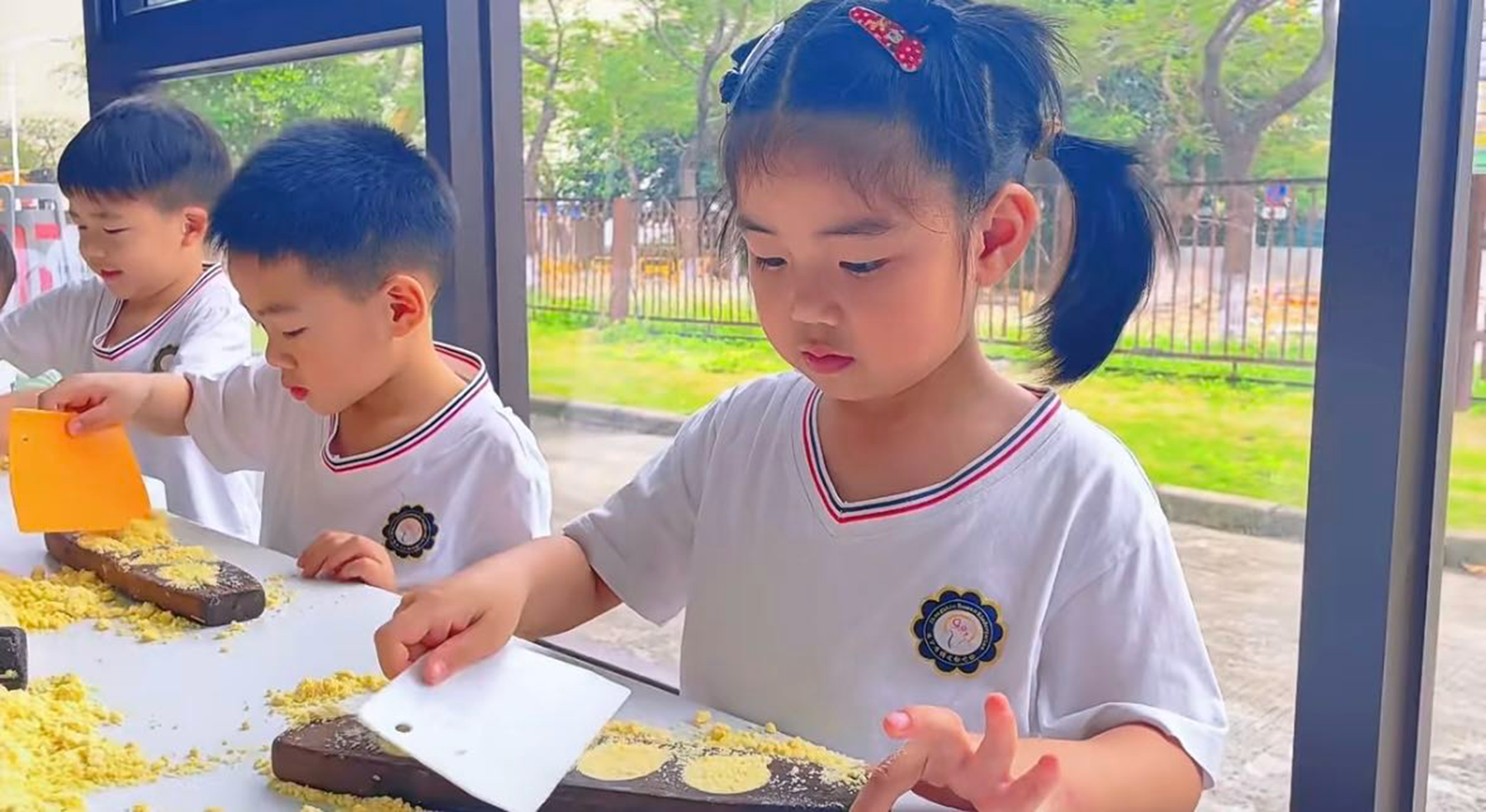 别看萌娃们年纪小,做起饼来可是有模有样的,小手轻轻按压、慢慢脱模,一个个带着精美花纹的杏仁饼在宝贝们的巧手中诞生啦!