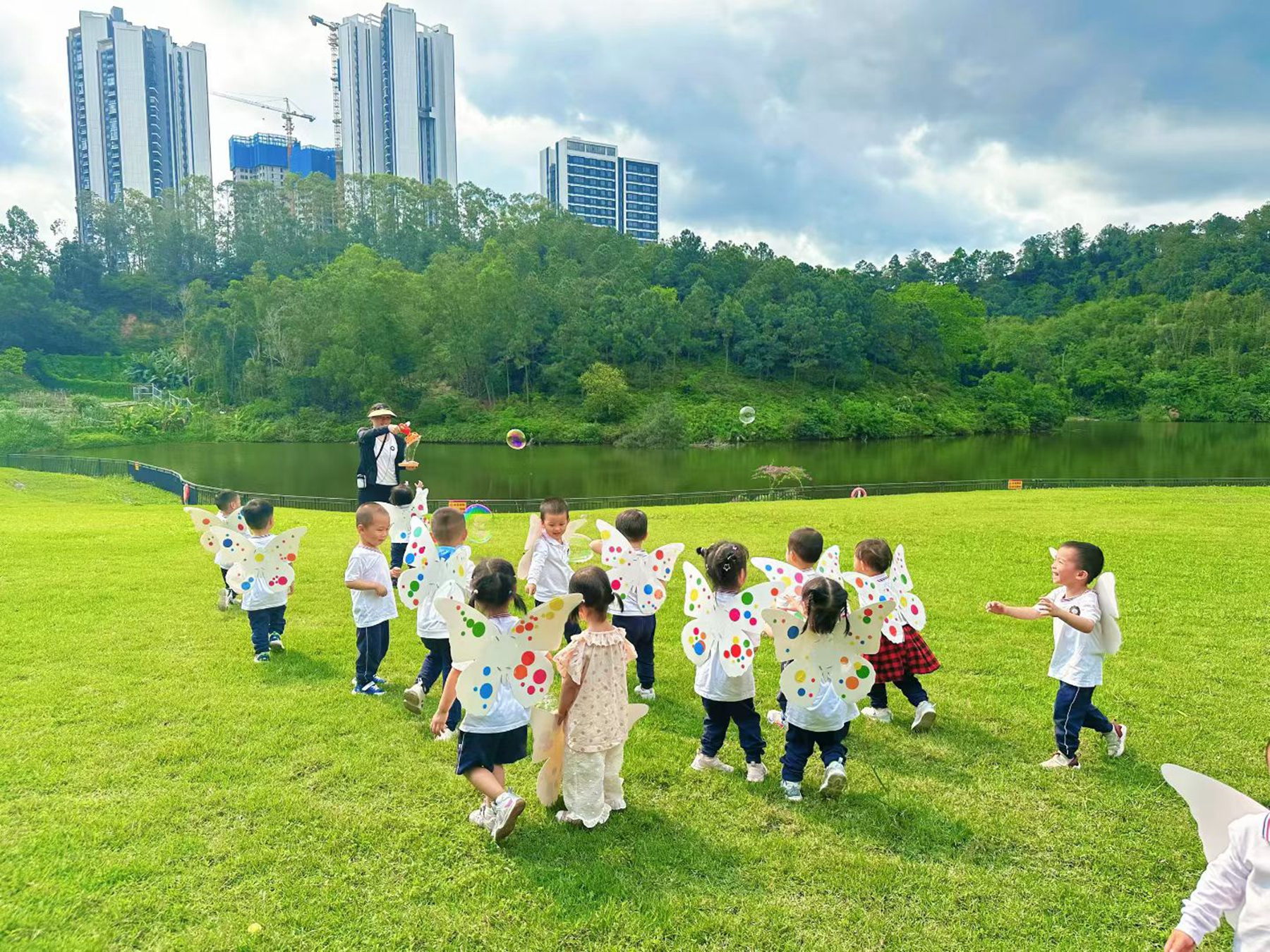 第三站:动手创作,解锁可爱小蝴蝶 春天有五颜六色的花儿,还有翩翩起舞的小蝴蝶~ 接下来,就是宝贝们的动手时间啦!萌娃们发挥自己的小创意,小手忙忙碌碌,粘一粘、贴一贴,一个个可爱的小蝴蝶就诞生啦!背着自己亲手做的小蝴蝶,萌娃们开启了“蝴蝶飞舞”小游戏。阳光下,五颜六色的泡泡飘了起来,宝贝们戴着蝴蝶翅膀,追着泡泡跑,像小蝴蝶一样翩翩起舞,笑声、欢呼声和泡泡一起,飘满了整个草坪,快乐值直接拉满。