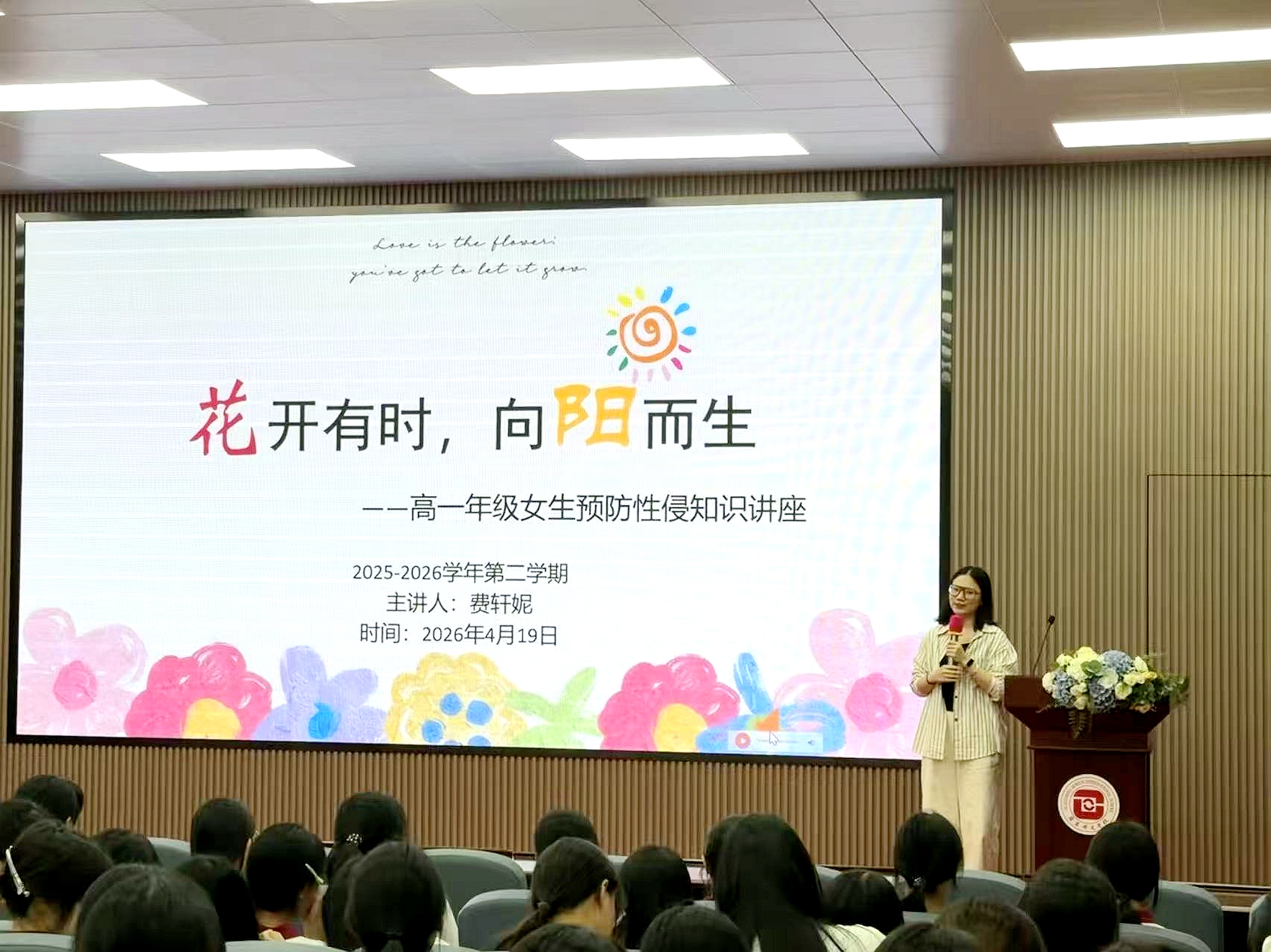 为加强博文高一年级女生青春期安全教育,提升自我保护能力,呵护青少年健康成长,2026年4月19日,博文高中部在综合楼407会议室举办“花开有时,向阳而生”女生预防性侵专题知识讲座,主讲人为高一年级心理老师费轩妮。高一年级全体女生参加本次活动。