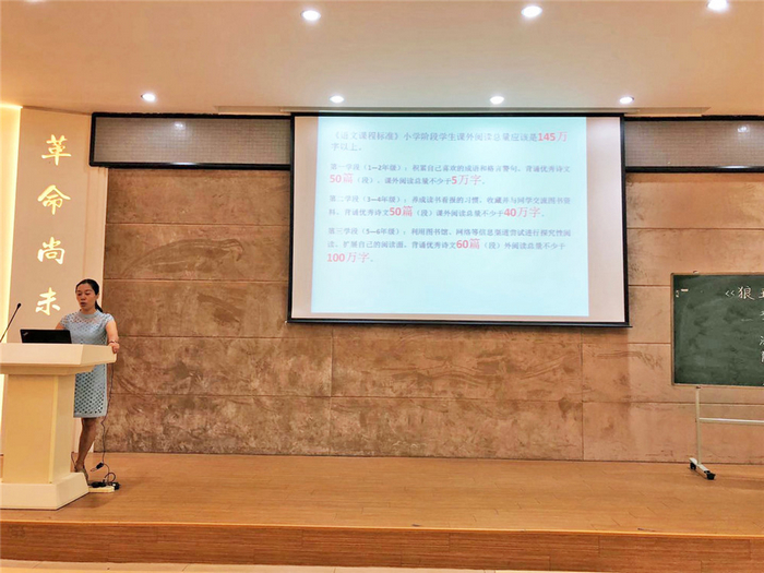 最后由科组长张新媛老师以“让最美阅读,浸润最美的童年”为主题发表讲话,以语文课程标准为核心,解读课标中对阅读的要求,细化到各年级如何落实学生阅读的书目,时间,方法和展示。