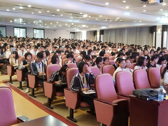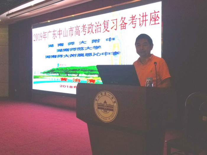 为了高三政治教师更全面、更深入地了解全国卷的特点,更好把握高三备考方向,提高2019年备考的精准度和有效度。在中山市教研室的安排,10月11日下午,中山市全体高中教师和中山市一中高三文科班学齐聚一中五楼报告厅,聆听湖南师大附中黄治清老师做的高考复习专题讲座。黄老师主要围绕2010-2018年全国高考政治“命题新变化”、“答题新要求”探讨答案的生成方法主题,非常有针对性地对高考材料题答案进行详细的分析,运用三段论等方法对高考题答案进行剖析,让我们更好地了解高考材料题答案的生成。