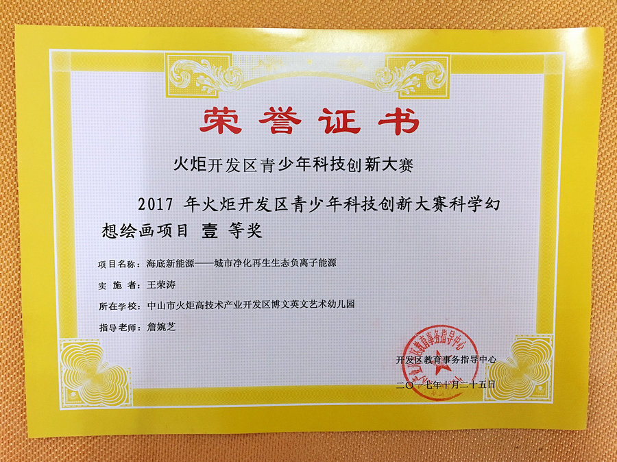 日前由火炬区教育事务指导中心举办的2017年火炬开发区青少年科技创新大赛科学幻想画项目比赛降下帷幕,博文英文艺术幼儿园的孩子在家长们的大力支持和老师们的精心指导下,取得可喜的成绩。