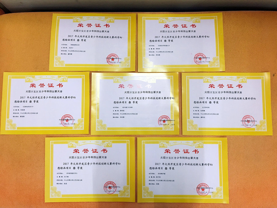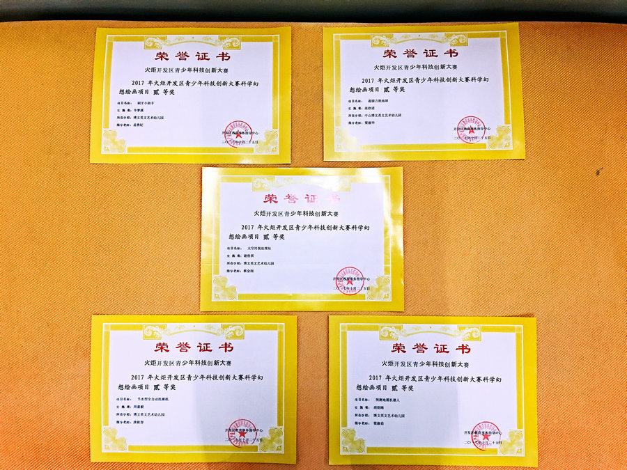 每一个参赛孩子都精心准备、细心创作,发挥了他们的无限创意,他们热爱绘画,沉浸在五彩缤纷的世界中,他们的作品透射出单纯质朴的意景和孩童的本真。经过评选,王荣涛小朋友出色的表现,荣获2017年火炬开发区青少年科技创新大赛科学幻想画项目比赛一等奖;毕梦溪、张钦诺、谢俊祺、周嘉毅、胡韵晞小朋友荣获2017年火炬开发区青少年科技创新大赛科学幻想画项目比赛二等奖;吴若宁、李宥汐、何泳恩、陈怡孜、冉兰熙、林子奕小朋友荣获2017年火炬开发区青少年科技创新大赛科学幻想画项目比赛三等奖。