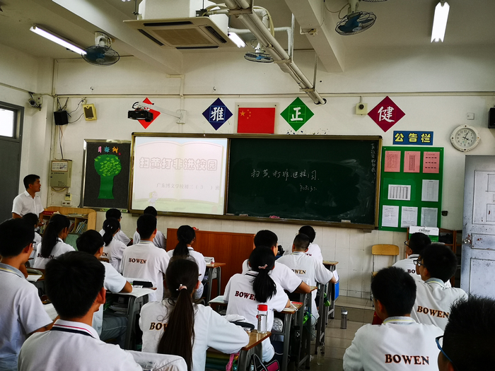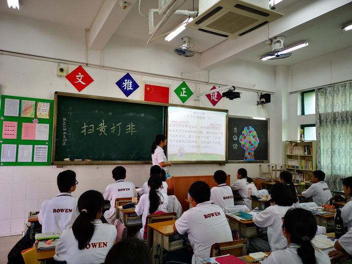 为维护校园纯净文明的育人环境,进一步加强未成年人思想道德建设,保障广大学生健康成长,根据相关会议精神及文件要求,结合广东博文学校初中部具体实际,11月5日下午,广东博文学校初中部各班级召开了“扫黄打非”进校园主题班会教育活动。