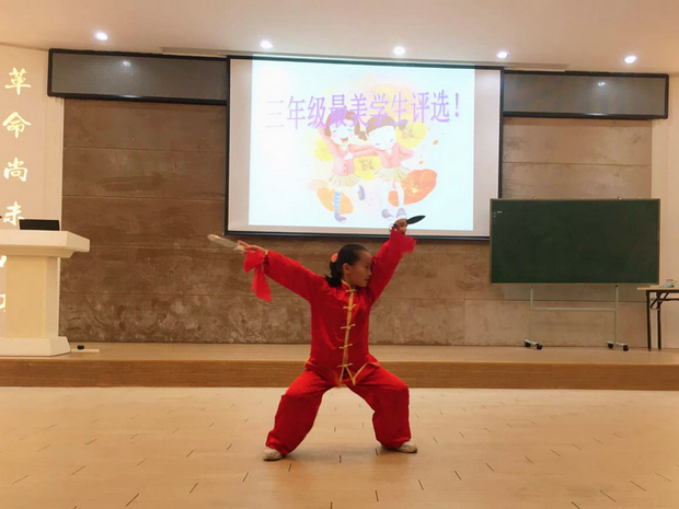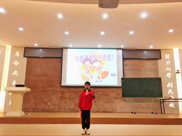 活动开始,首先由年级组长贺老师向全体学生评委们阐明活动意义和评选要求。随后,九名“最美学生”候选人进行自我介绍,通过对个人经历的简单介绍,使各位学生评委们更加了解他们身上的闪光点。与此同时,多才多艺的候选人还进行了精彩的才艺展示。既有巾帼不让须眉的《武林风》,又有动听悠扬的钢琴曲;既有气氛活跃的《青春修炼手册》歌舞表演,又有活力十足的伦巴……才艺展示精彩纷呈,学生评委们都不禁频频拍手叫好。最后经过一番紧张的投票,三年级(7)班的黄彤欣同学和三年级(8)班的陈蜜儿同学脱颖而出,获得三年级“最美学生”称号。