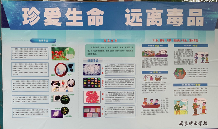 中小学生正处于生理、心理发育时期,好奇心强,辨别是非能力弱,抵制毒品侵袭心理防线脆弱,加之对毒品的危害性和吸毒的违法性缺少知识,容易受到毒品的侵袭。针对这一特点结合学生实际,广东博文学校通过海报宣传,对毒品的概念、种类、毒品的危害以及中小学生应该如何远离毒品做了介绍,并对当前的新型毒品冰毒、摇头丸、K粉以及它们的危害和防范等常识作了详细讲解,全面增强了学生珍爱生命,远离毒品的自我防范意识。