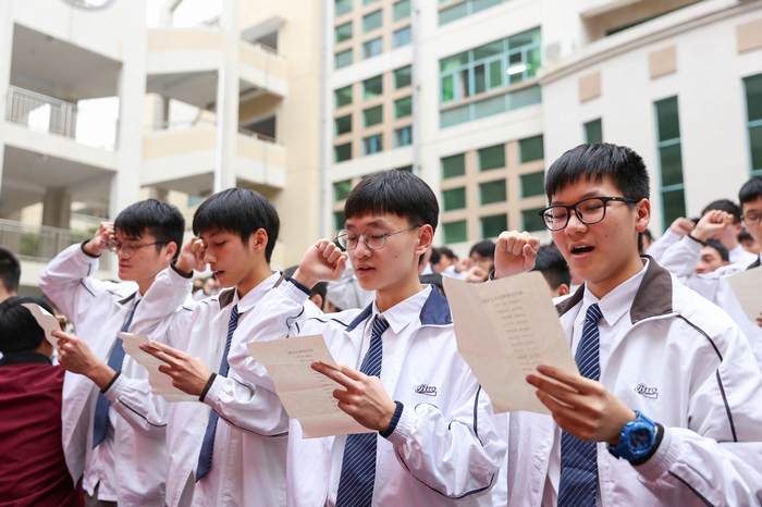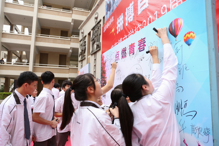 揭牌和宣誓是整场活动的最高潮。张海经校长、袁广颂年级组长为高考倒计时100天揭牌,每一个高三班级在班长和团支部书记的带领下庄严宣誓,郑重许下承诺:苦战百日,前程无量。如火六月,决战沙场。日月可鉴,誓创辉煌。荣我母校,不负众望。二零一九,我要飞翔……最后,全体教师和学生在“拼搏百日,筑梦未来”的展板上郑重地签上自己的名字。