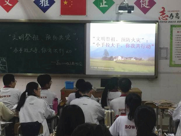 之后,各年级各班举行了“文明祭祖,预防火灾”主题班会。班会课上,班主任向学生讲解了文明祭祀,预防森林火灾的有关知识,号召大家践行鲜花祭祀、网上祭祀、植树祭祀等文明、低碳的祭扫方式。