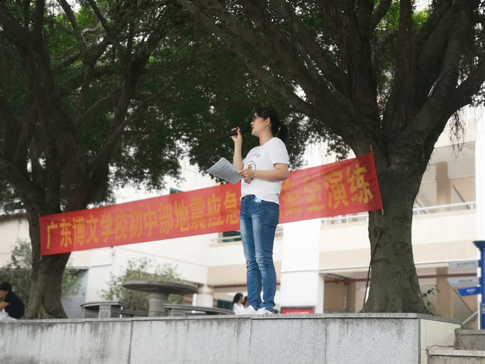 随着一阵“叮铃铃”铃响,全体教师按照疏散应急预案提前到岗到位,当警报响起时,那急促的警报将全体师生带入模拟地震的情境中,各年级各班的学生在老师们的组织下,选择相应的逃生出口,双手抱头,快速有序地疏散。学生们按照预定的路线,不慌乱、不拥挤、不跑跳、疏散到预定的安全地点集合。整个过程紧张有序,全体师生全部在规定时间内撤离到安全地带。随后,广东博文学校初中部余甜主任对此次疏散演练活动进行了细致的总结,强调了逃生中还需要注意的安全事项。
