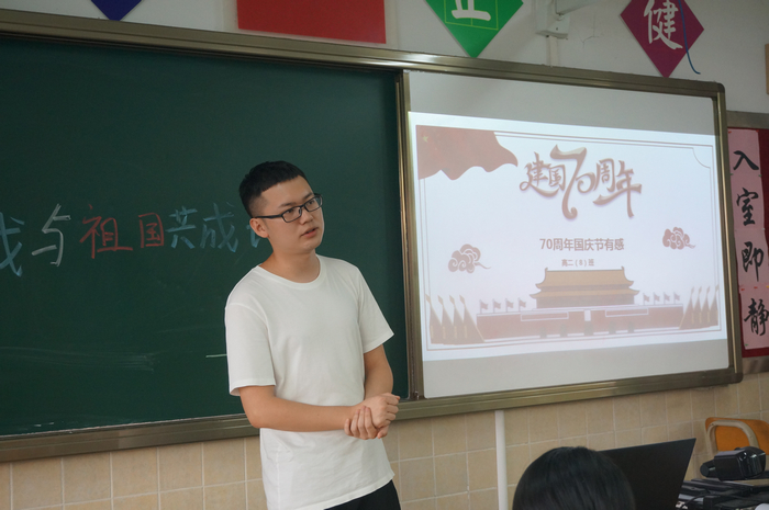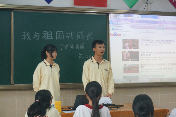 今年是新中国成立70周年,国庆节假期刚刚结束,师生们还沉浸在节日的喜庆当中,为进一步巩固和强化爱国教育,广东博文学校高中部于10月9日举行“我与祖国共成长”主题班会。