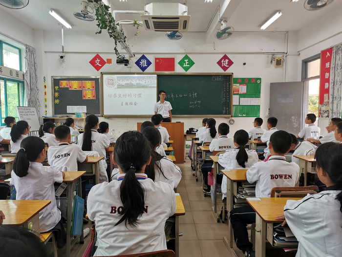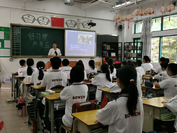 叶圣陶说:“什么是教育?简单一句话,就是要养成习惯”。一直以来,养成教育是学校各项教育的重点,广东博文学校一直落实“六个陪伴”的培养目标。为引导学生培养良好的学习和生活习惯,2019年10月21日下午,初一年级各班举行了以“好习惯,终身益”为主题的班会活动。