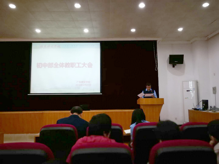 金鸡辞旧岁,银狗报春来。2月23日下午四点,广东博文学校初中部全体教职工集中407室,开展了2017-2018学年第二学期开学工作会议,会议由初中部校长汤勇主持并发表讲话。全体教职工欢聚一堂,共同迎接新学期的到来。过去的一年,忙碌而有收获,喜悦伴着汗水。2018年,有梦想、有期许、有目标。不忘初心,砥砺前进,收心鼓劲,共绘蓝图。
